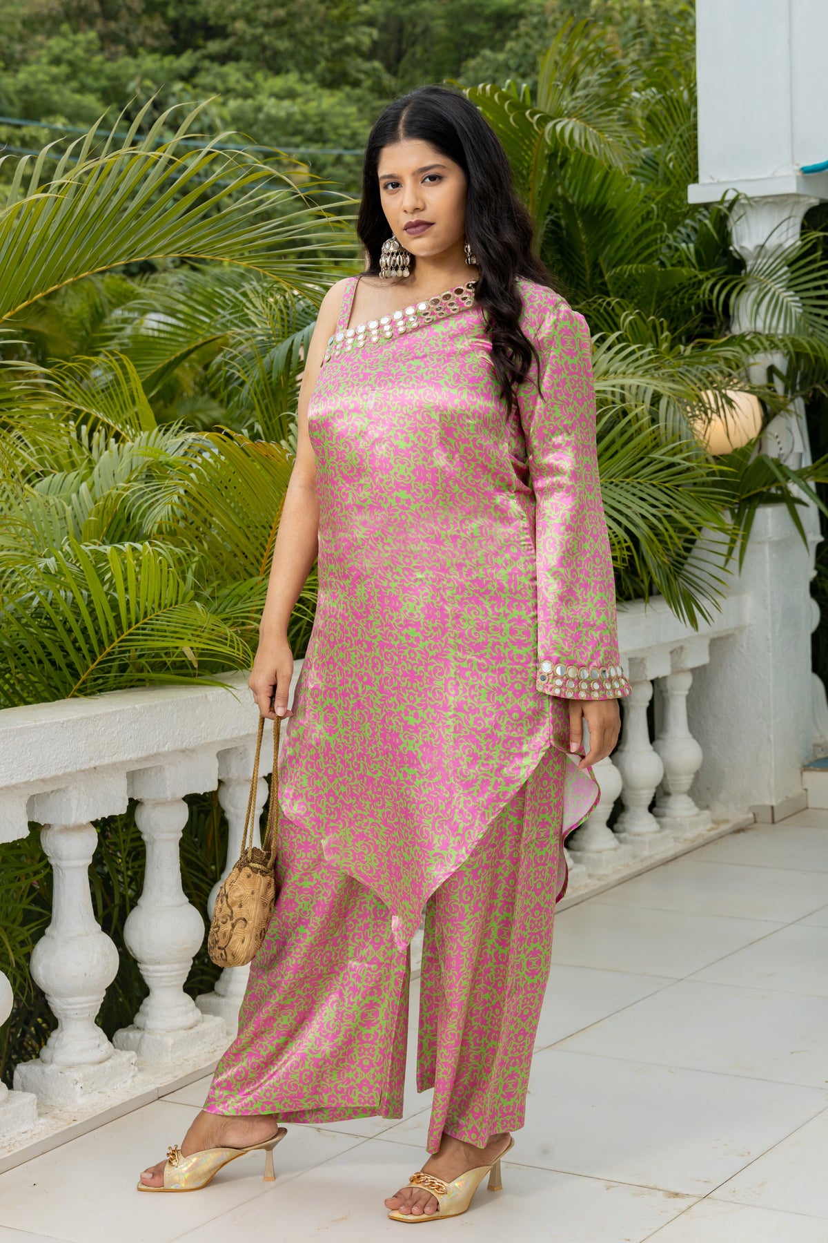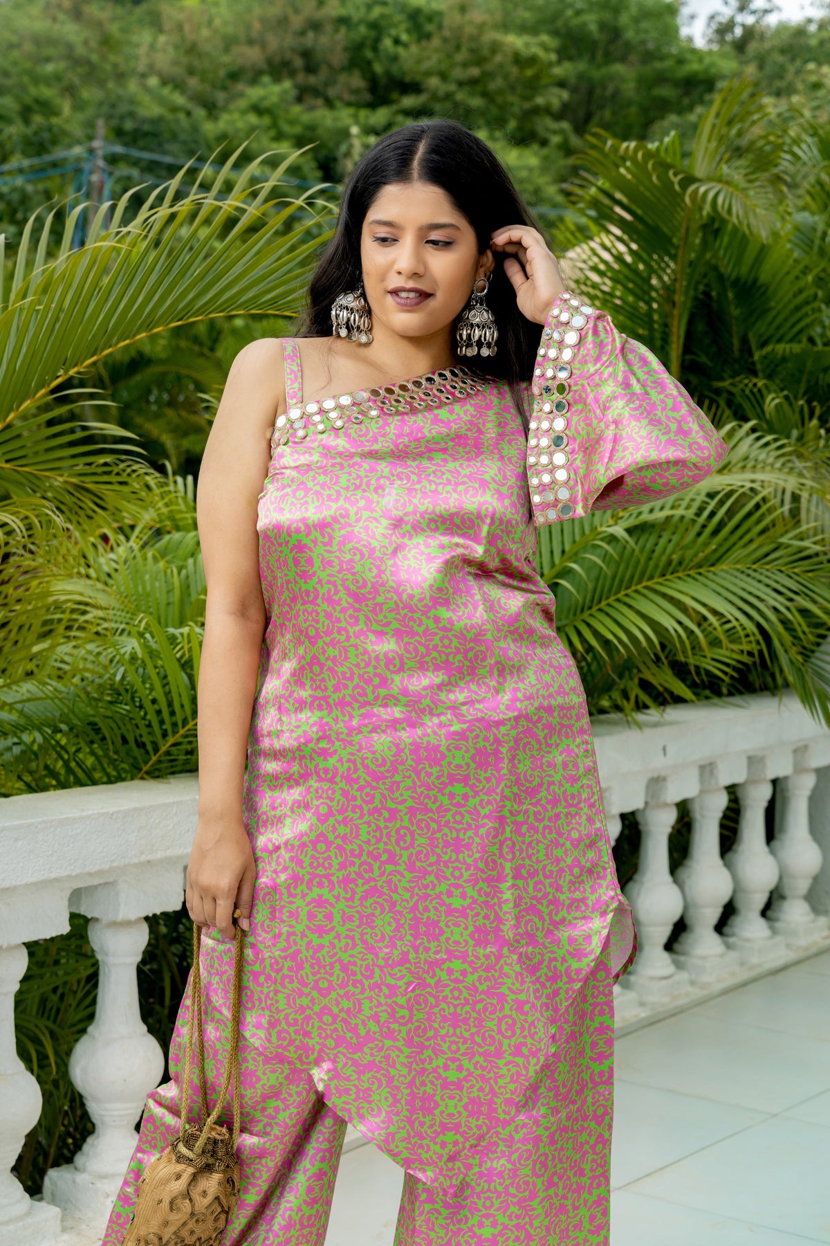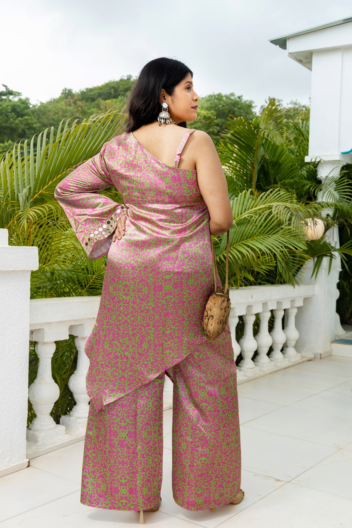 One-shoulder bell-sleeve top and wide leg pants with mirror work