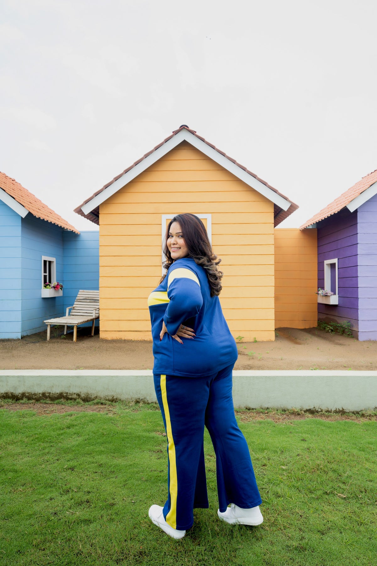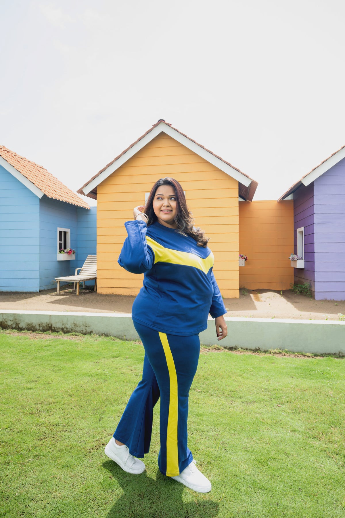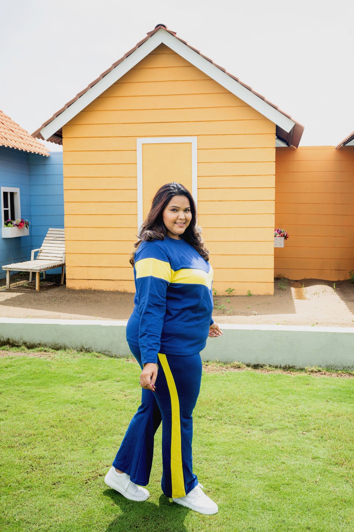 On-the-go dark blue and yellow color-blocked tee shirt with flared pants