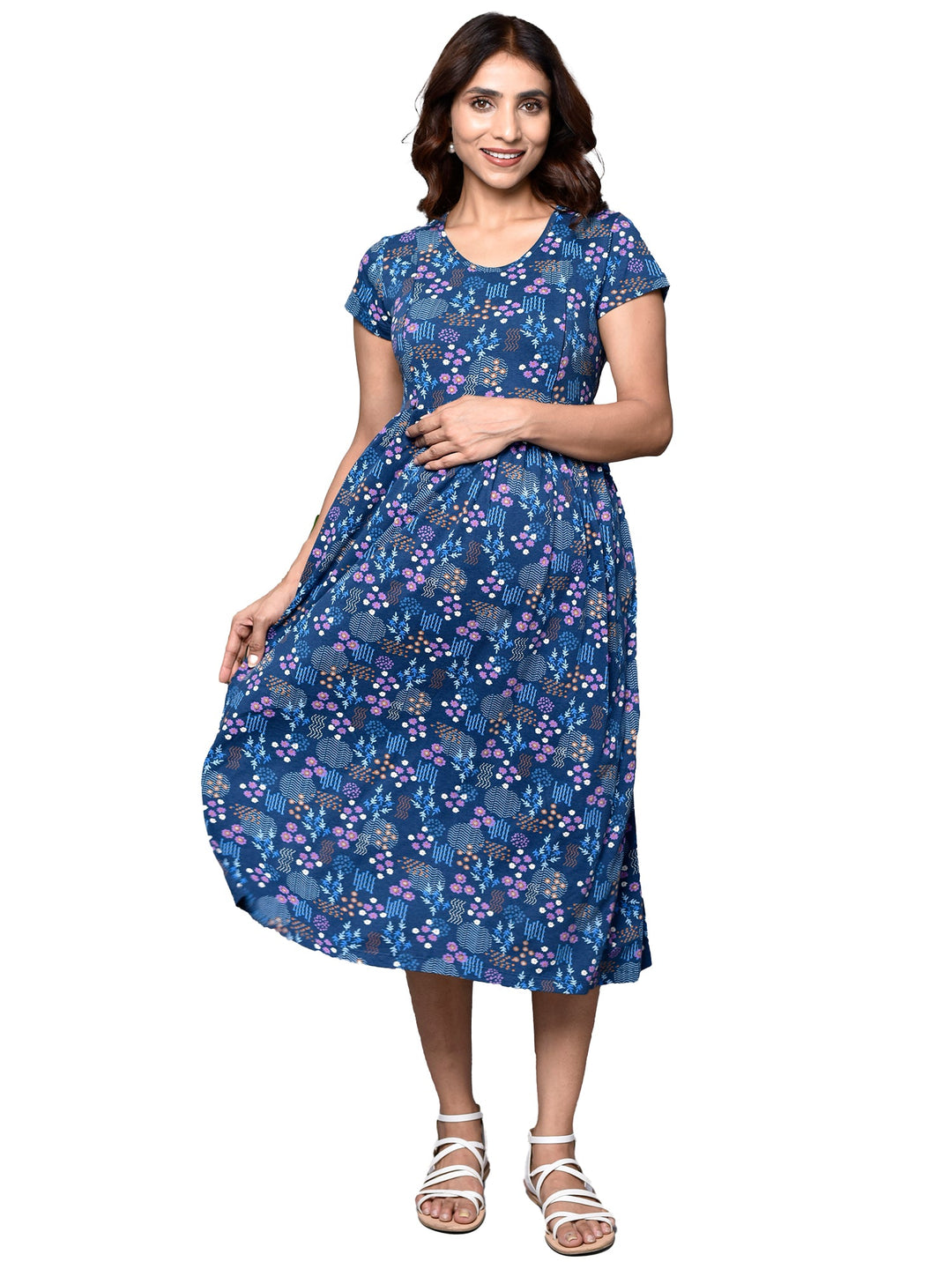 Organic Cotton Maxi Length Maternity Dress with short sleeves ISML018-Blue Vintage Garden