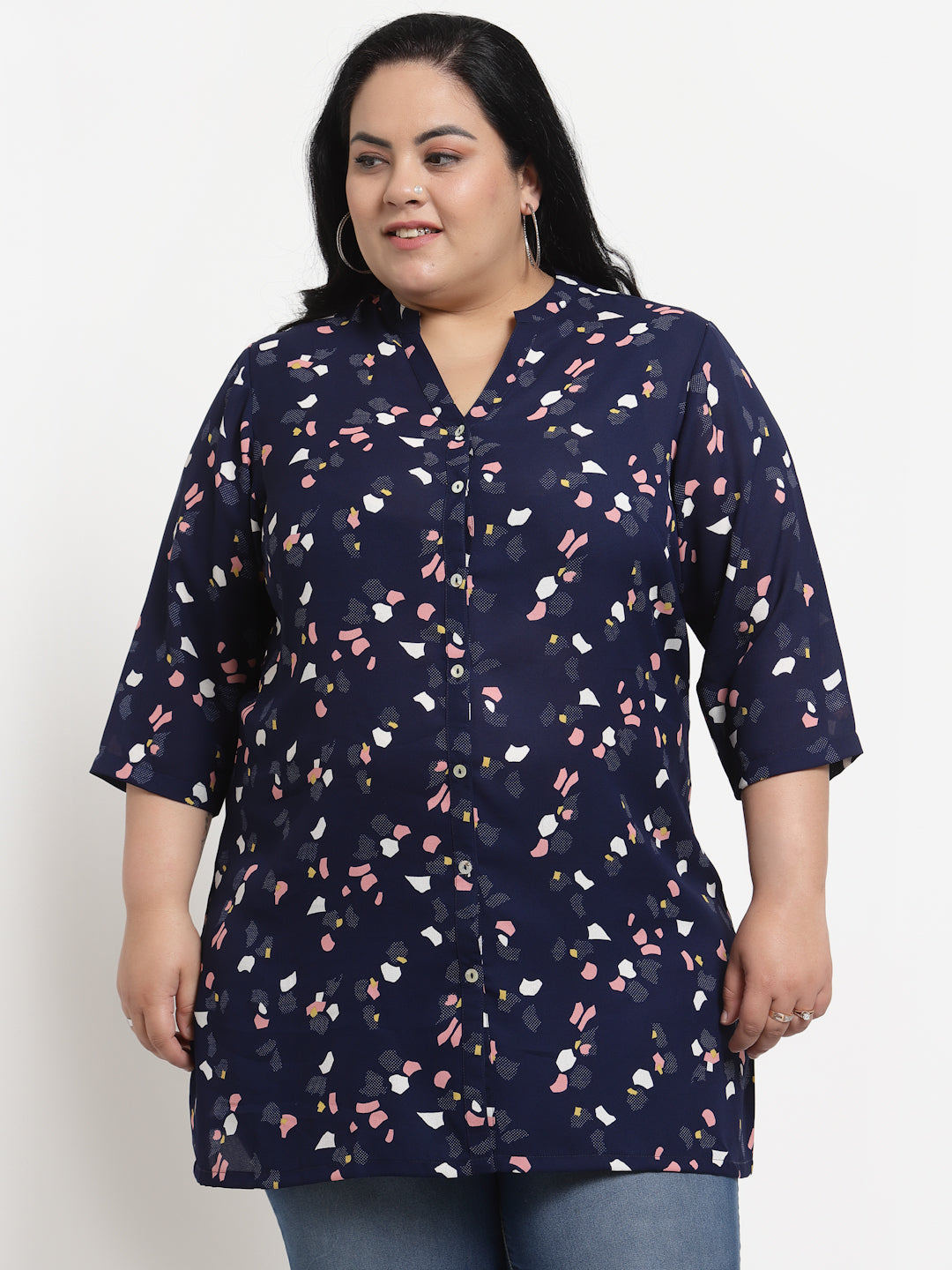 Plus Size Women Navy Blue Pink Mandarin Collar Printed Tunic