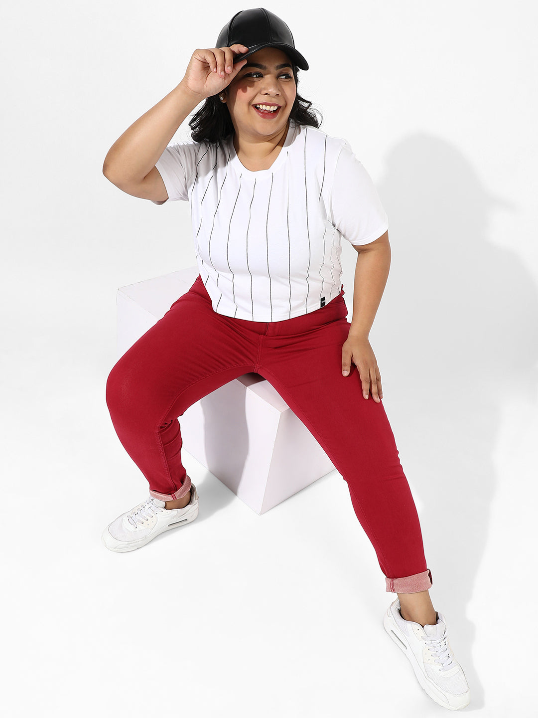 Look your ravishing best in these gorgeous women's plus size red colour pop denim jeans that can add a pop of colour to your wardrobe and daily wear. These plus-size red pop denim jeans from Instafab Plus are a must-have addition to any wardrobe and are crafted from high-quality 100% cotton denim, that offers high comfort for everyday, all-day wear and durability.