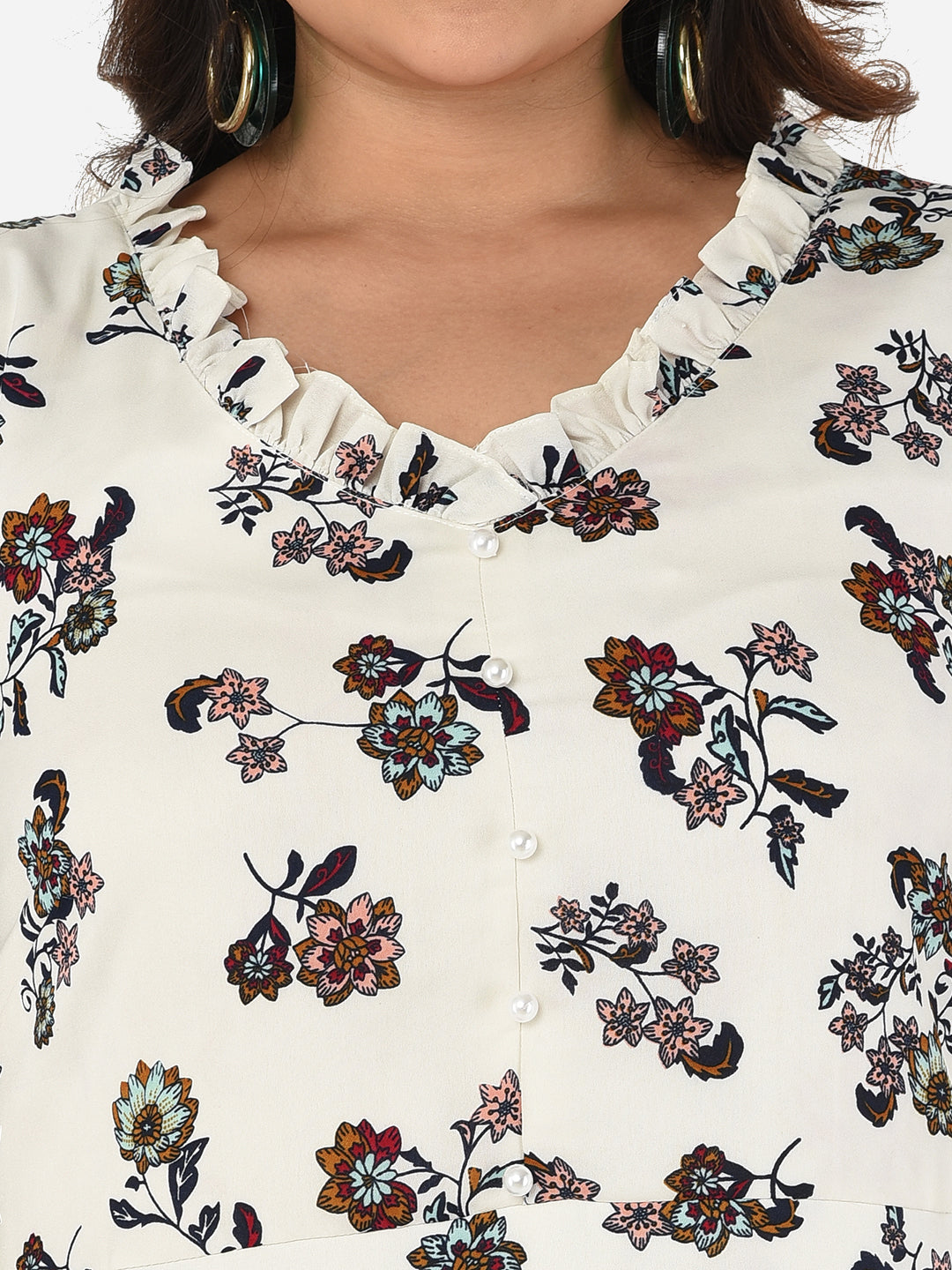 A casual chic plus size dress in beautiful floral print and cuff long sleeves completed with a ruffled V neck and pearl buttons.