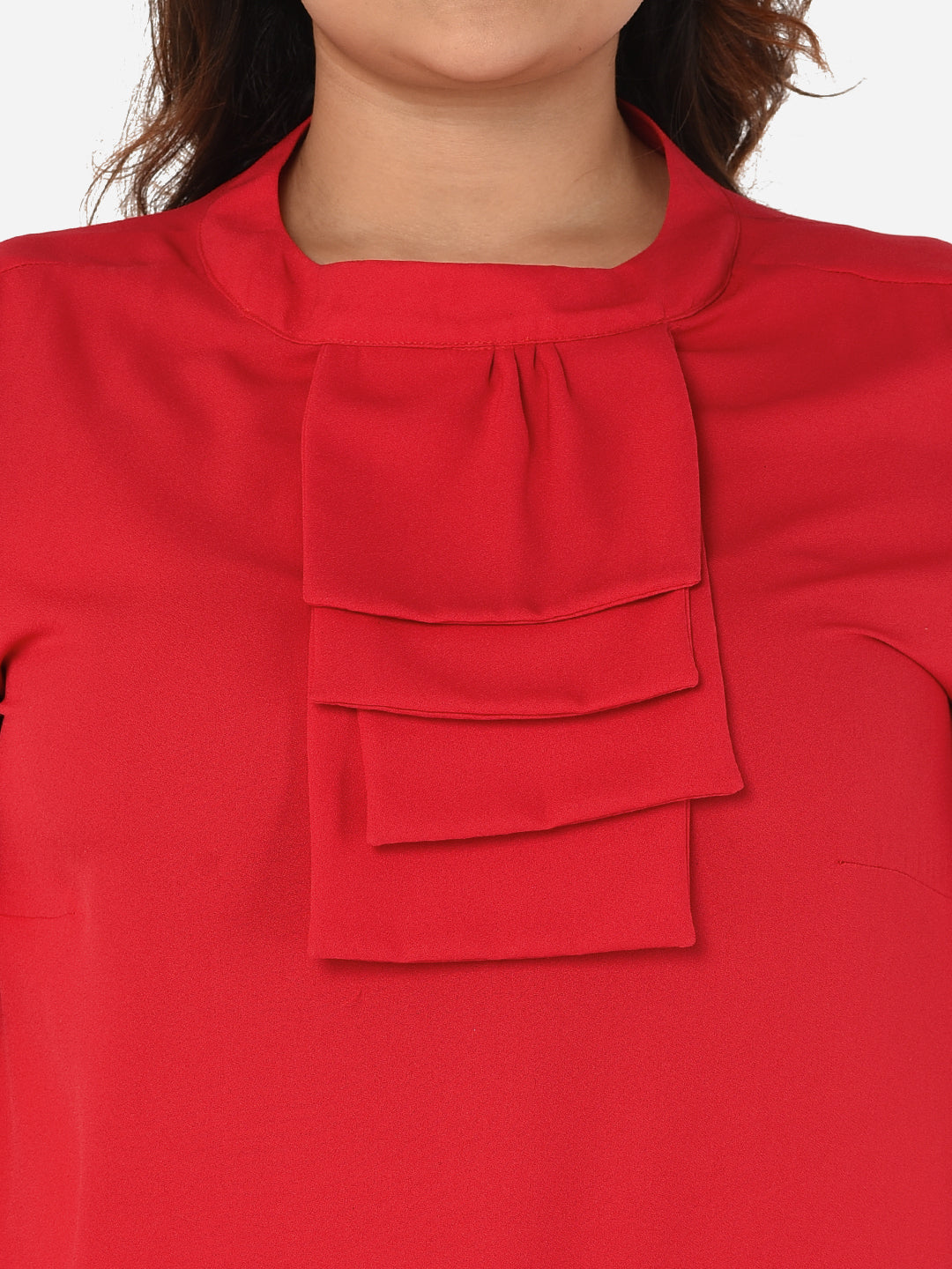 A contemporary red plus size top with a cascade collar and puff sleeves.
