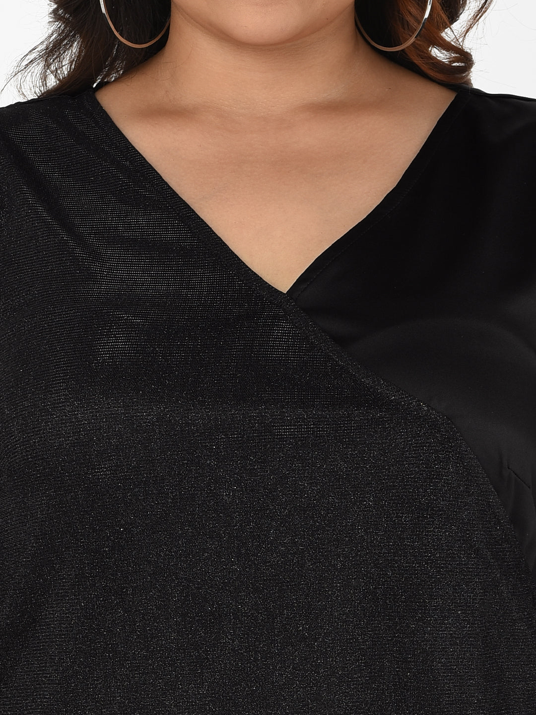 A chic satin-shimmer cowl style plus size dress with contrasting overlap design and full sleeves.