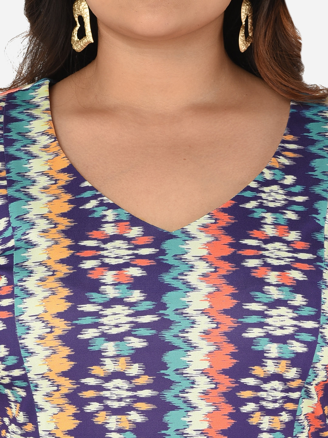 A V-neck plus size midi dress in colorful Aztec print completed with a stylized hem in short slits and metallic buttons.