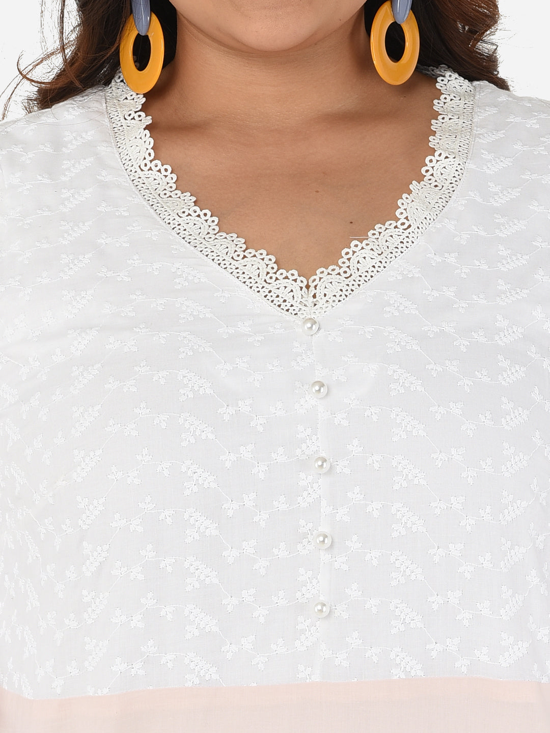 A boho-chic color blocked tiered plus size maxi dress with a chikankari top, lacy neckline and bishop sleeves.