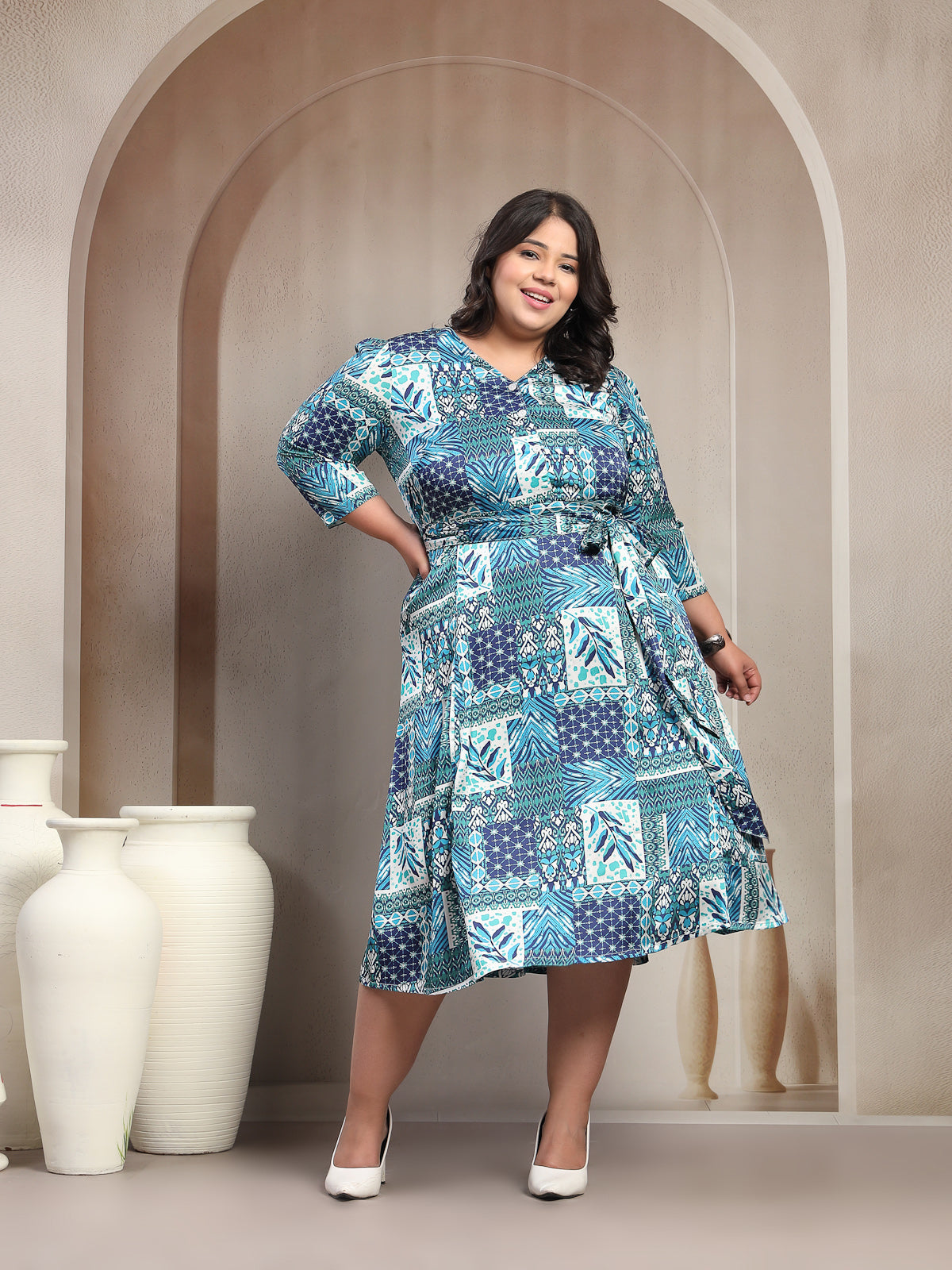Plus Size Ethnic Motifs Printed A-Line Midi Dress With Belt