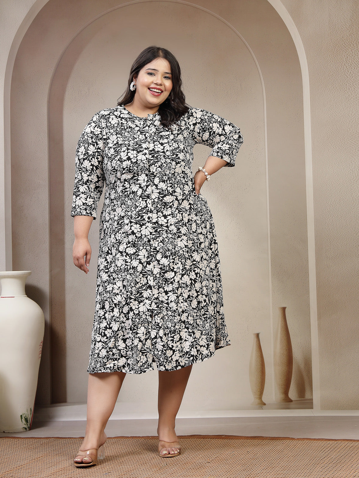Plus Size Floral Printed Round Neck Shirt Midi Dress