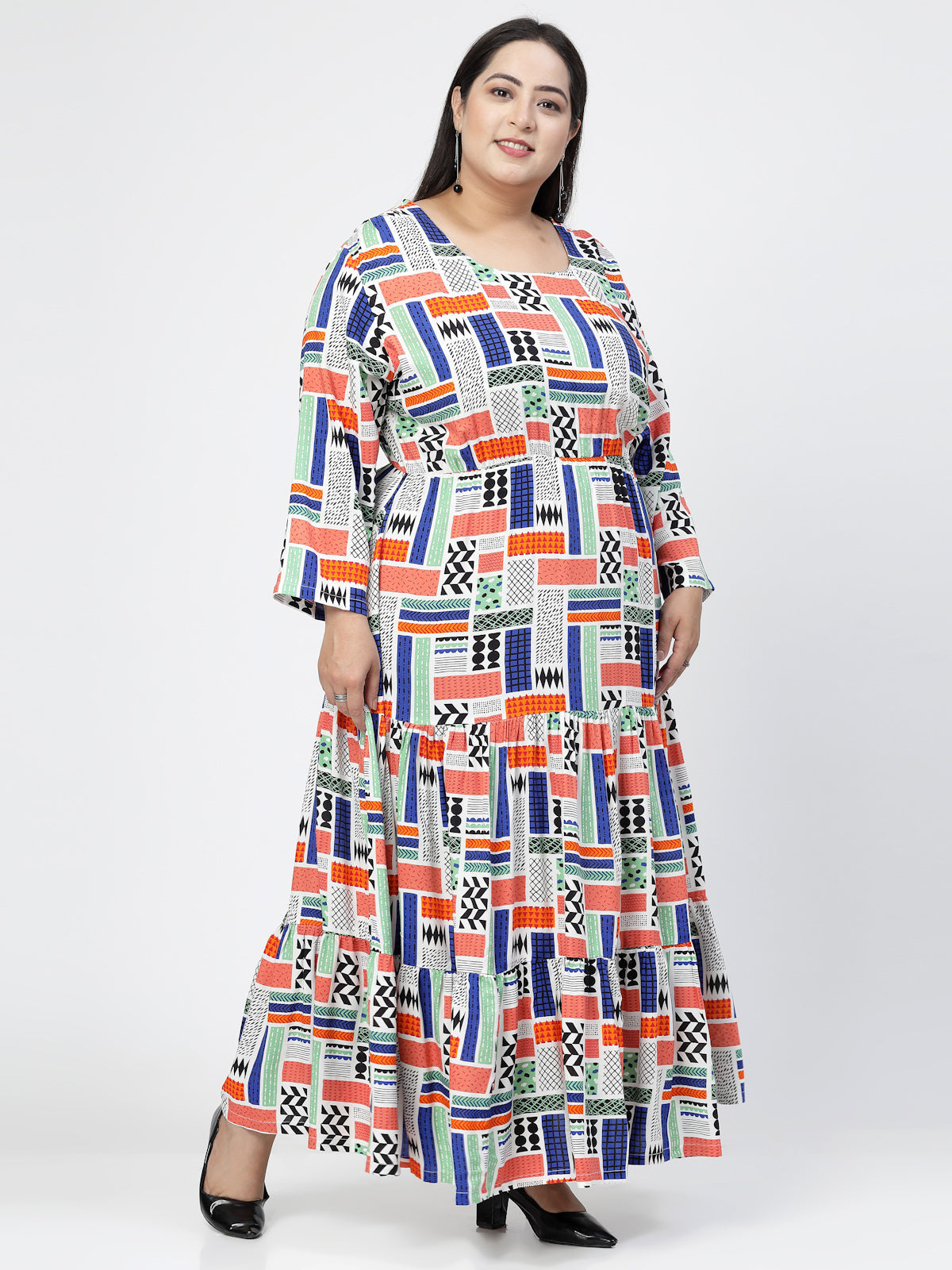 Round Neck Long Sleeves Geometric Print Maxi Plus Size Dress