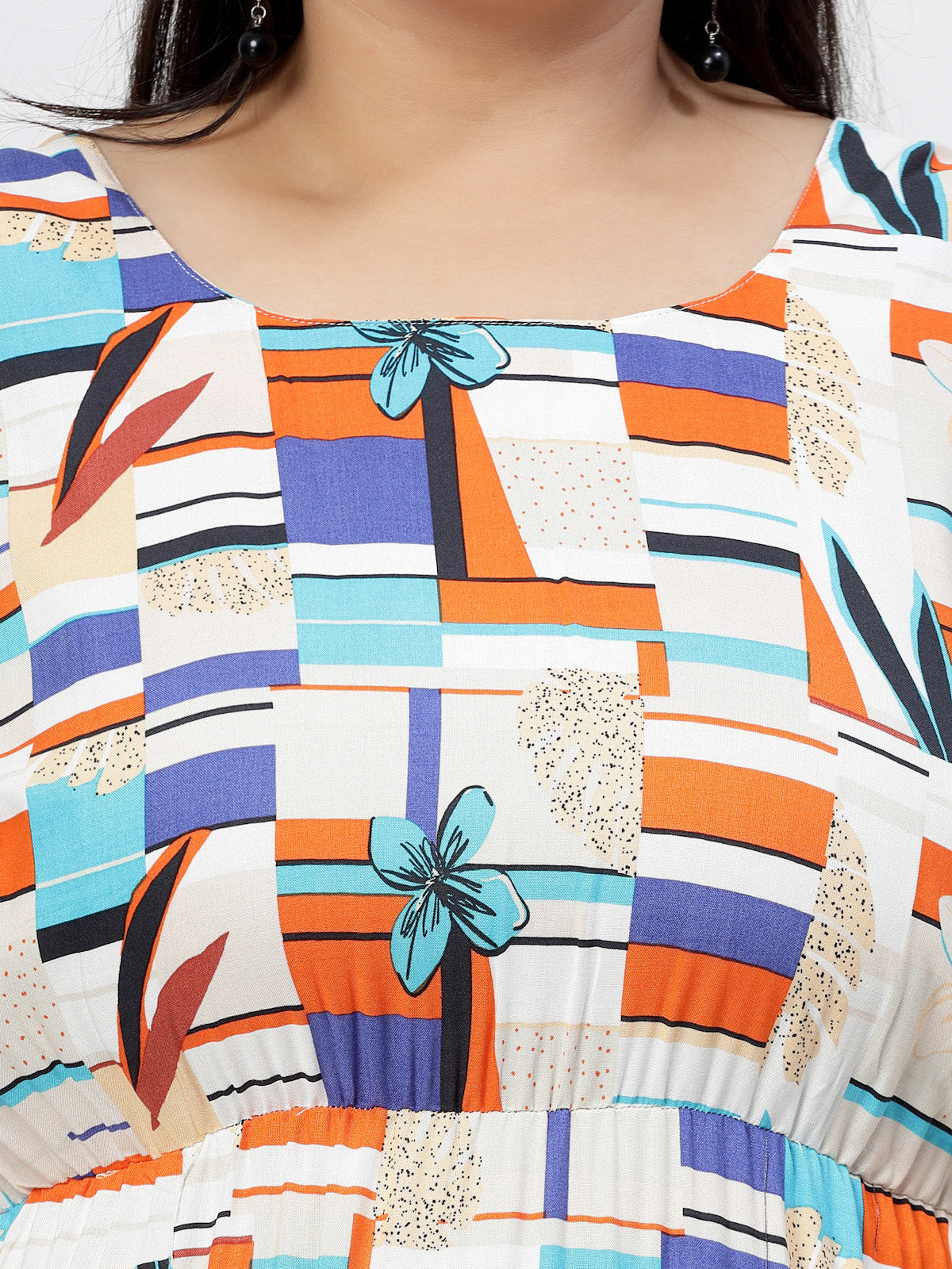 Round Neck Long Sleeves Geometric Print Maxi Plus Size Dress