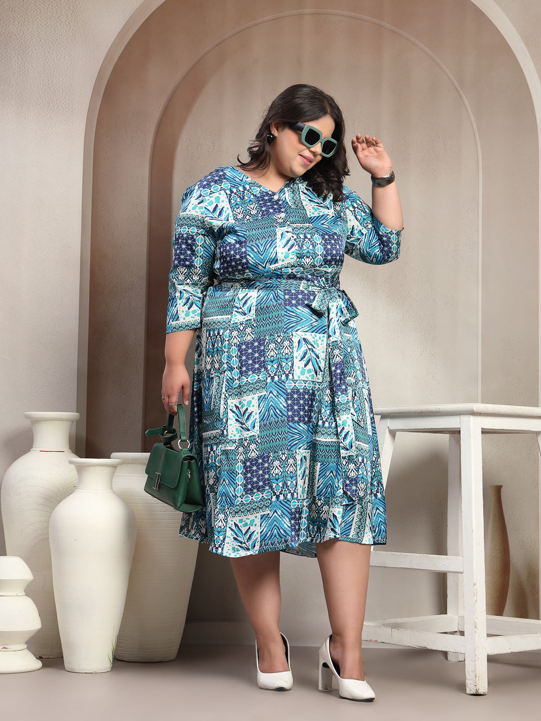 Plus Size Geometric Printed Wrap Midi Dress