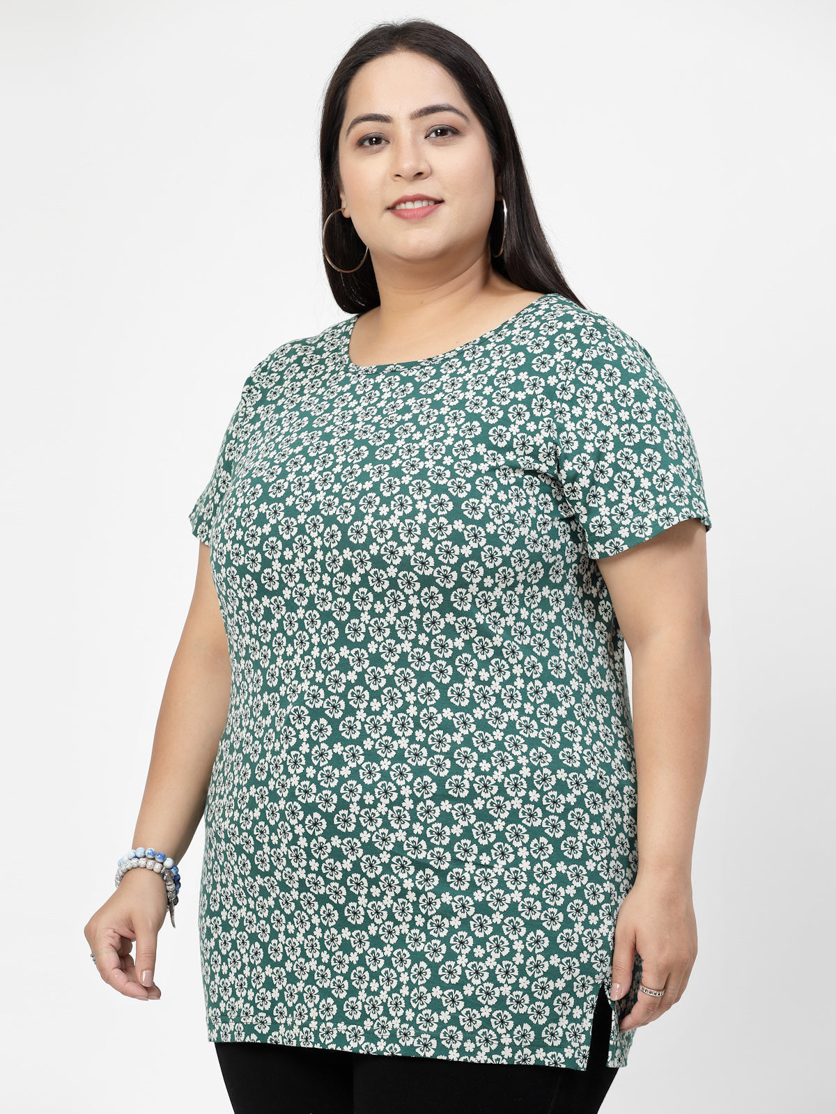 Plus Size Green Floral Printed Round Neck Regular Fit Cotton Casual T-shirt