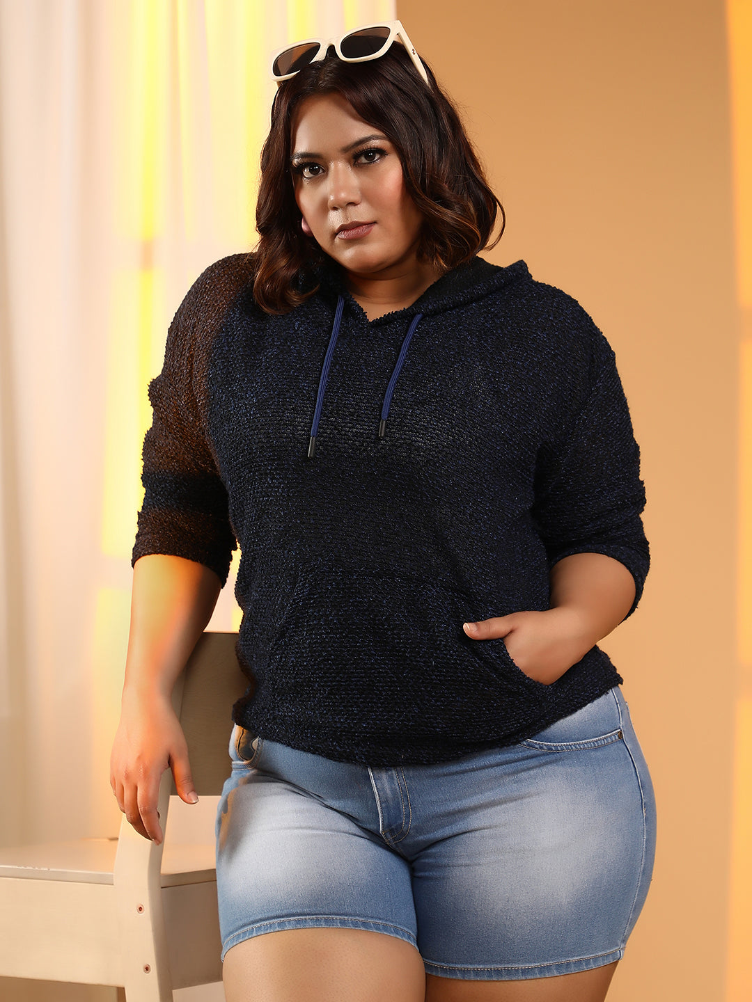 Plus Size Navy Blue Full Sleeve Longline Cotton T-shirt