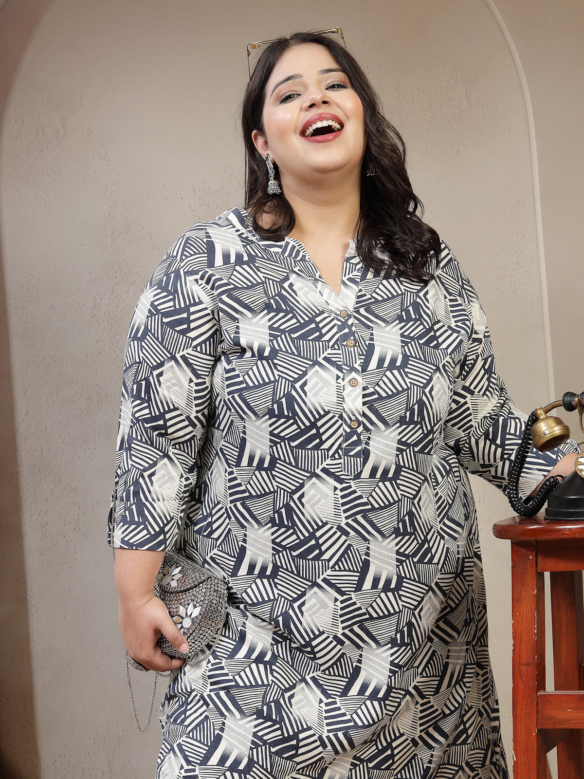 Plus Size Geometric Printed Mandarin Collar Thread Work Straight Kurta