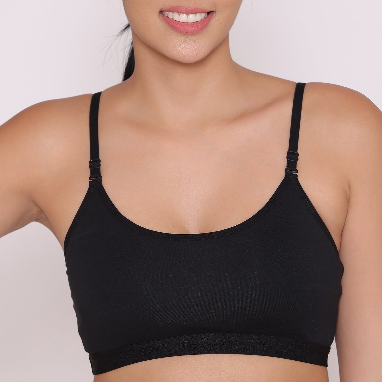 This Beginner bra is specially designed and crafted for schoolgirls and teenage girls who require low to medium support. This bra comes in a double layer for a smooth shape, appearance, and reduced transparency. The back has the option of wearing it normally or making it racerback. The non-wired, lower band provides full cup coverage, stability, and support to the wearer. Made from cotton fabric makes it is super comfy and an ideal choice for everyday wear. This is a wire-free, lightweight, stretchy and soft Bra for gentle support and comfort. The underbust elastic helps prevent it from sliding up when your arms are lifted. Features-Soft fabric-covered elastic underband for gentle grip; Non-wired, Pullover style that is easy to wear without annoying hooks. These are available in Black, Evening Blue, Nude, Peach, Crepe colors.
