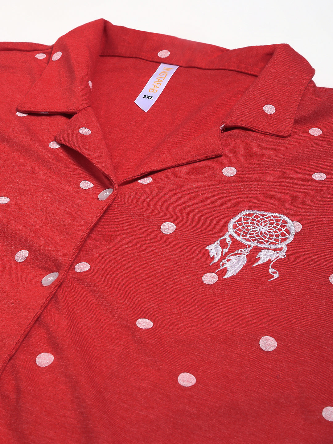 Introducing Women's plus size printed red nightwear from Instafab Plus. This plus size printed nightwear is the epitome of comfort and style for your bedtime routine. Crafted with meticulous attention to detail, this set includes a top featuring a spread neck and three-quarter sleeves and pants with an elasticated waist for a snug fit.