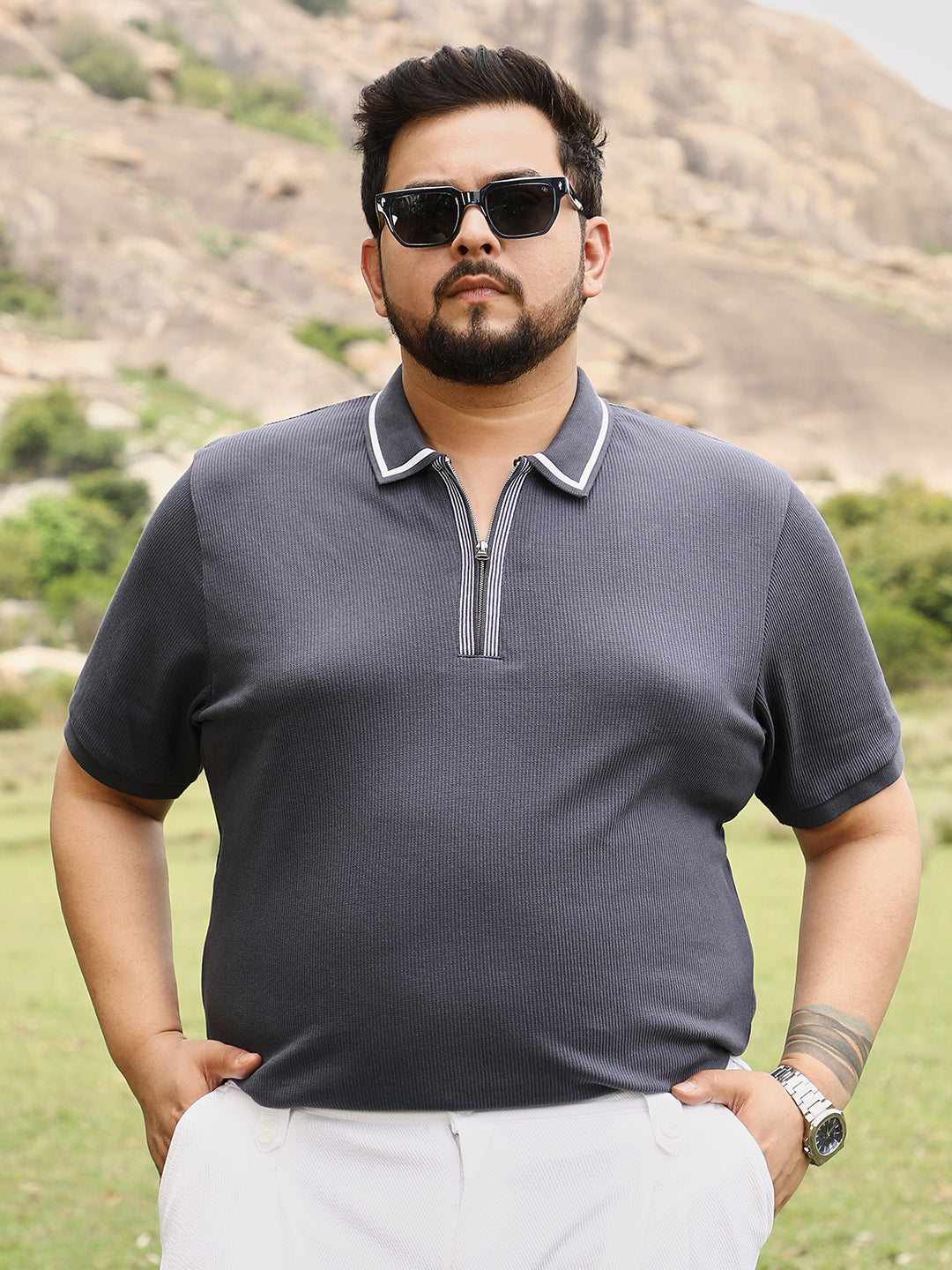 Solid Waffle Half-Zip Polo T-Shirt