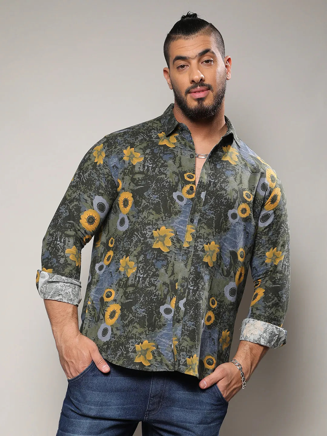 Olive Green Self-Design Horizontal Striped T-Shirt