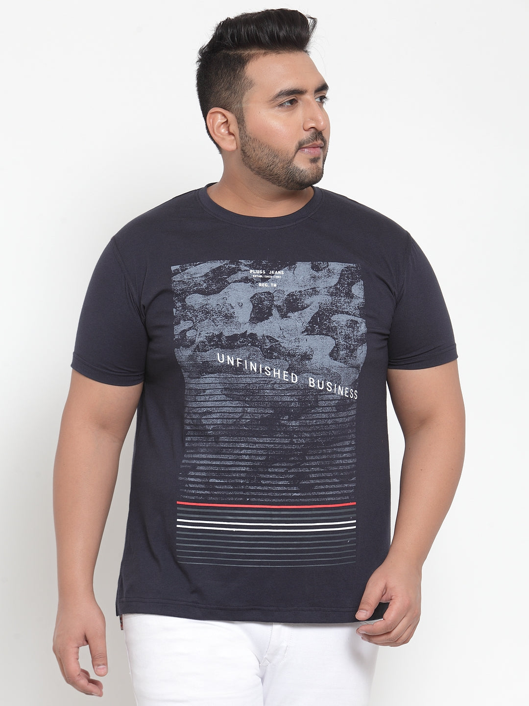 Plus Size Men Navy Blue Printed Round Neck Pure Cotton T-shirt