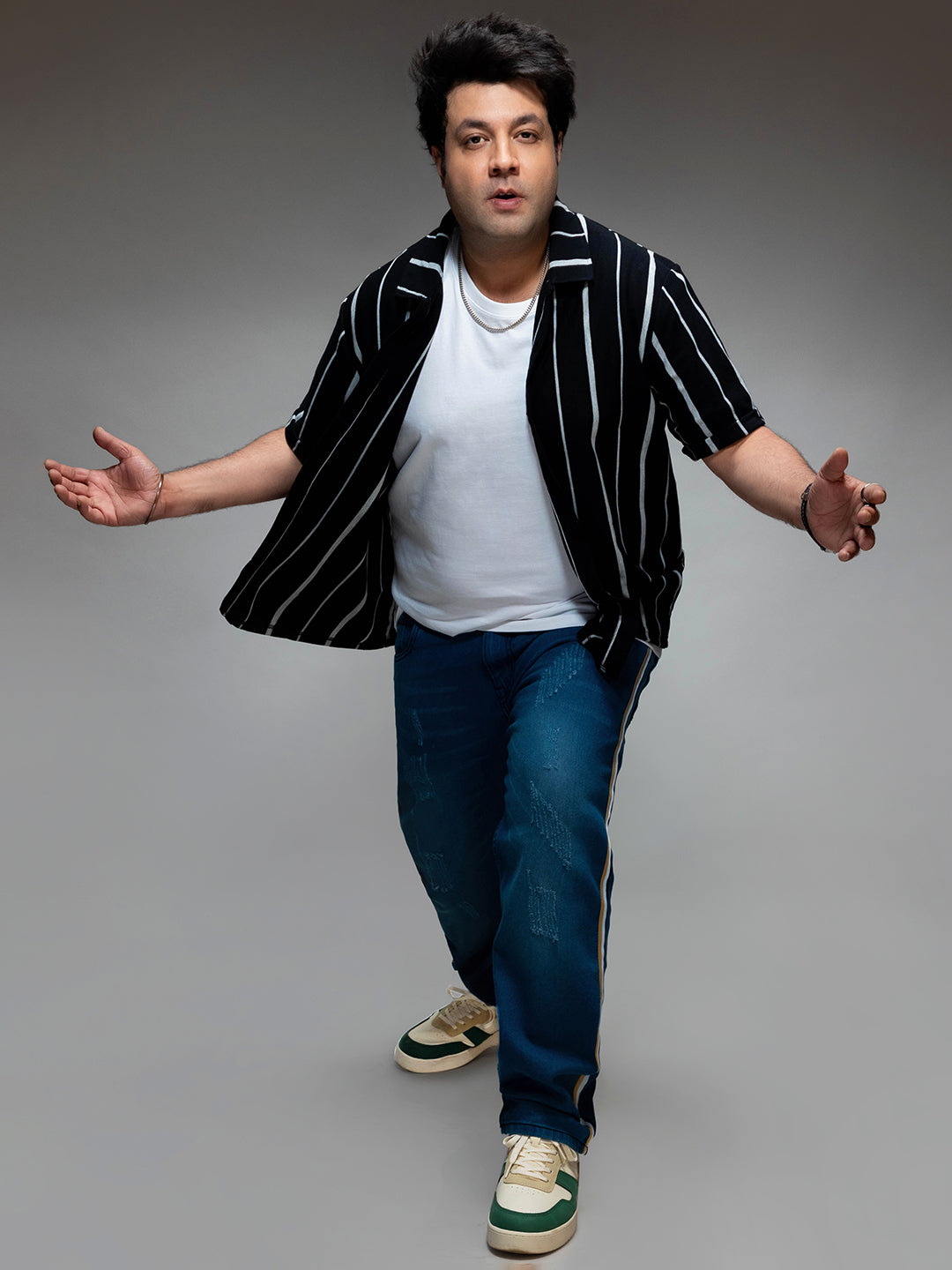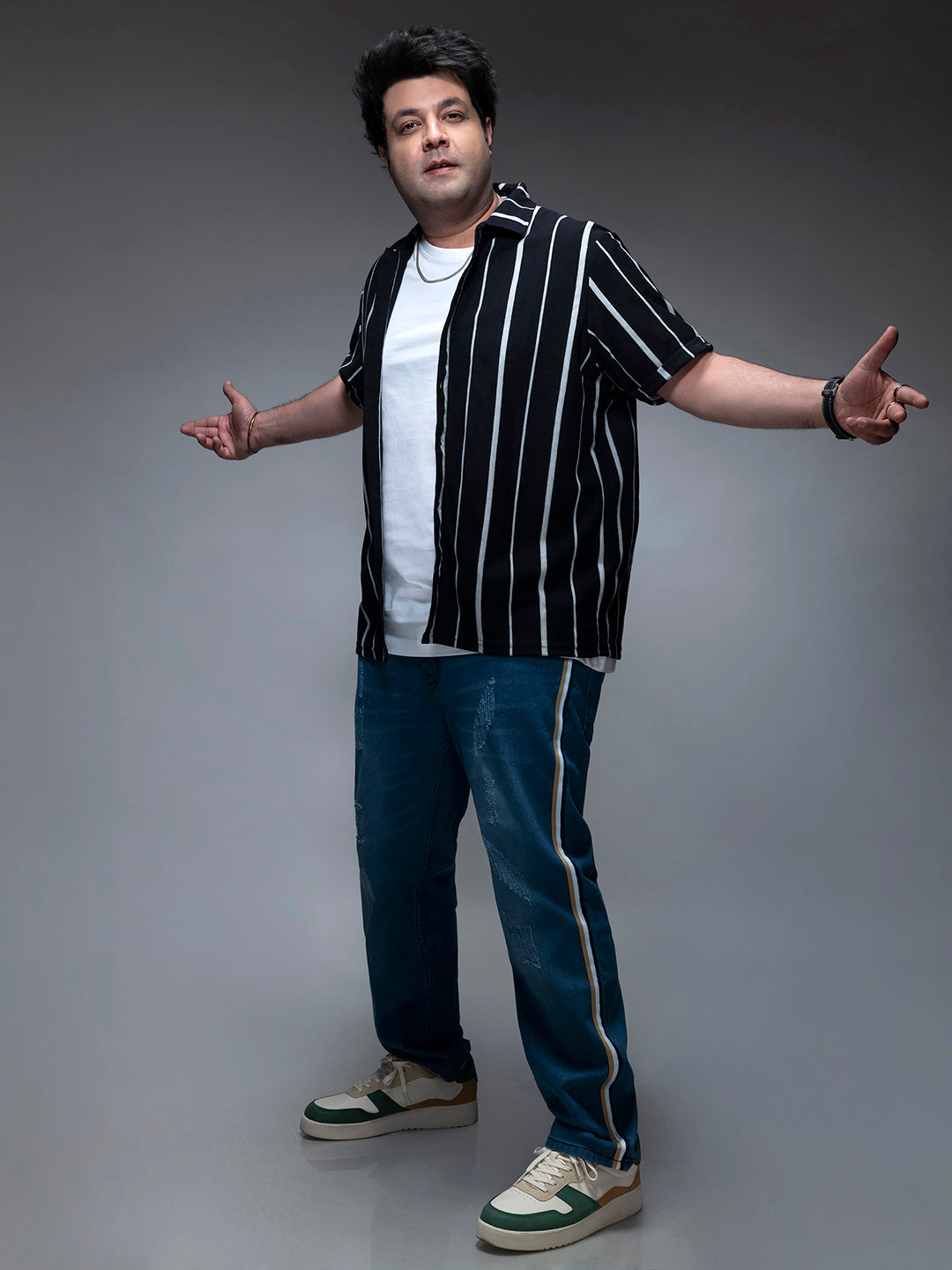 Sneakers, sandals, loafers, and leather brogues are great footwear choices to wear with our large-size black striped casual shirt.