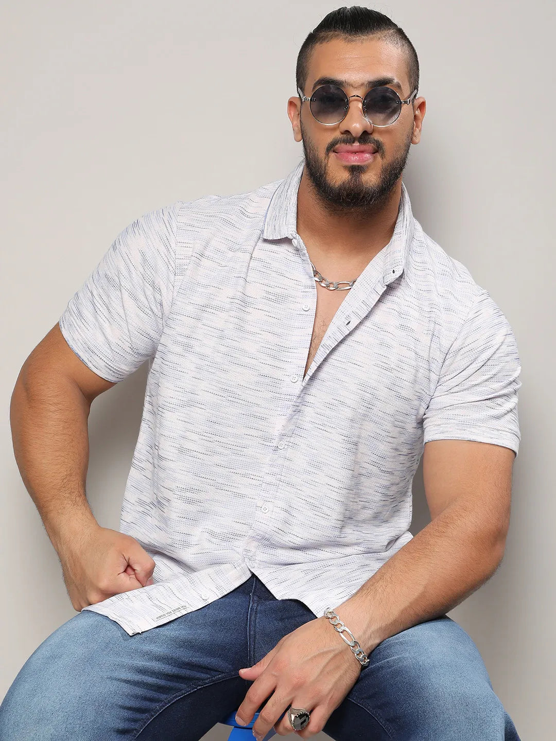 Light Blue & White Textured Horizontal Striped Shirt