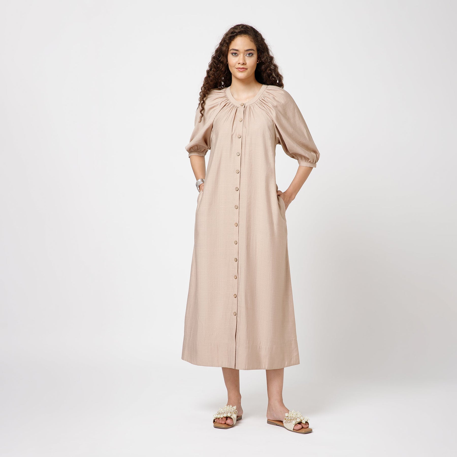Beige Long Dress With Puff Sleeves