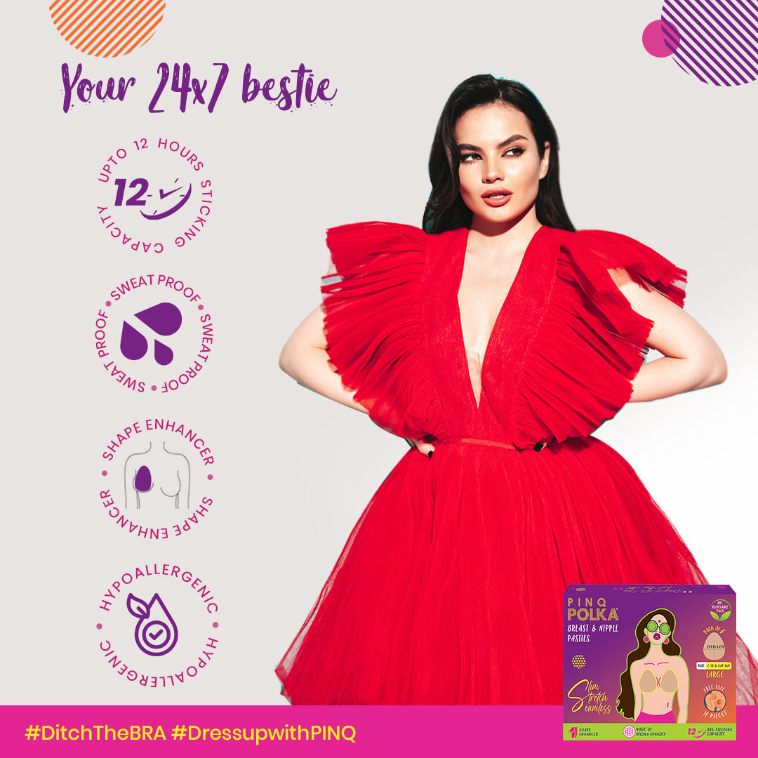 1st Time In India, ideal for larger breast sizes, combination of our Breast & Nipple Pasties and Reusable Nipple covers. It offers a comfortable solution for providing shape enhancement and lift to your breasts without the need for a traditional bra. Made from skin-friendly, hypoallergenic, and stretchable nylon and spandex materials, these pasties and tape adheres securely to your skin while remaining gentle and irritation-free. Ideal for use with light coloured shirts, strapless tops, see through dresses, backless tops, low-V dresses, deep neck dresses, wedding gowns, off-shoulders, sports bras, halter tops, swimsuit etc.