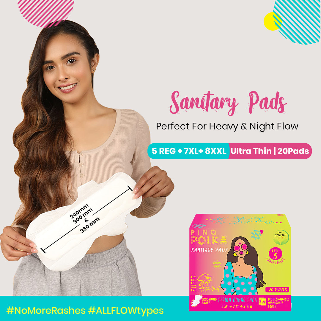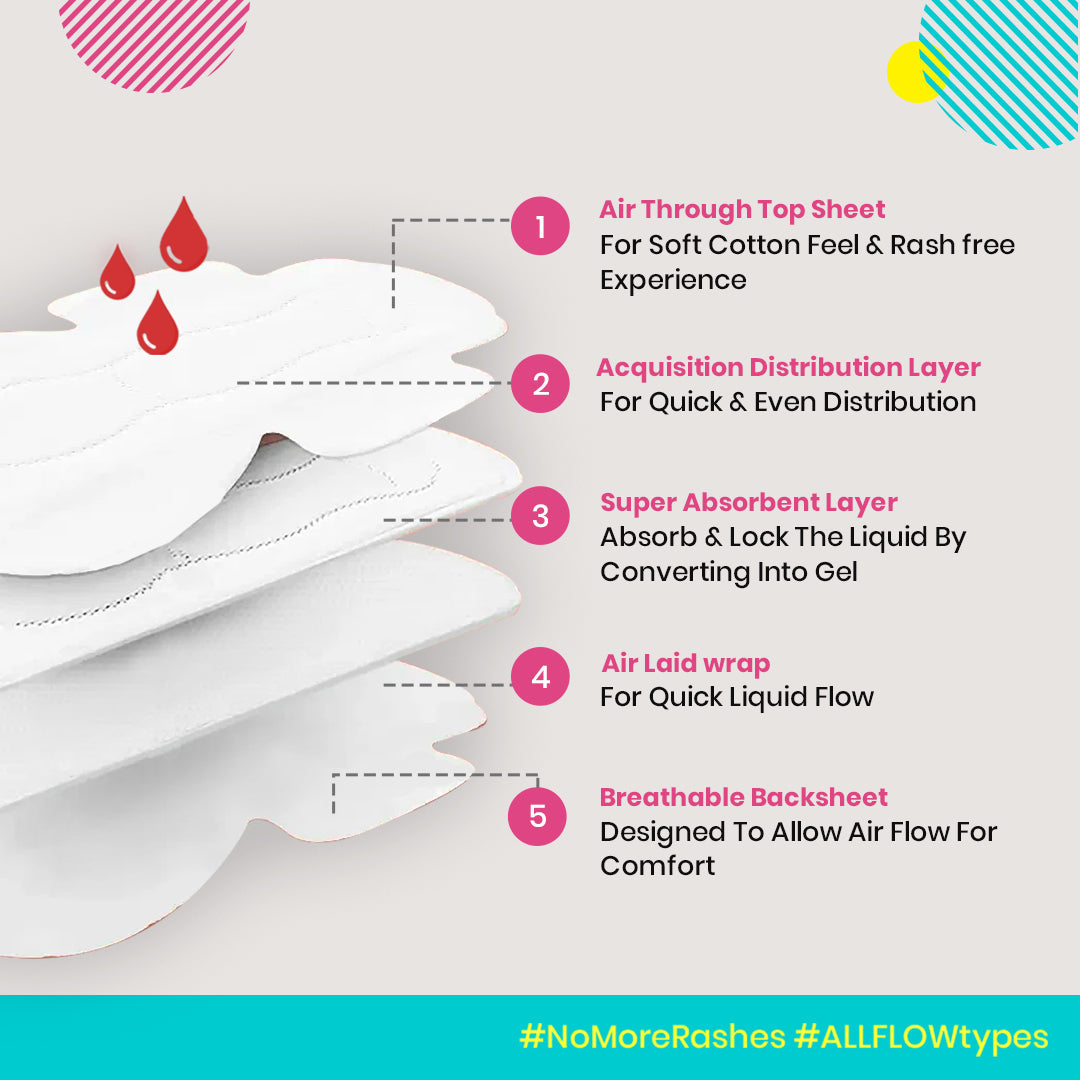 The pads are specifically designed for regular to heavy flow and night-use. Pads feature a premium cotton feel top sheet which is gentle on the skin, reducing the risk of irritation or rashes that can sometimes occur during menstruation, ensuring a comfortable fit. The use of high-quality cotton feel material adds an extra layer of comfort and ensures a pleasant experience throughout your period. The gel technology quickly absorbs and locks away the menstrual flow, preventing any discomfort or wetness. This feature helps you feel more comfortable and confident, even on heavy flow days. Double wings securely hold the pad in place, preventing any shifting or movement during physical activities, ensuring maximum leakage protection. The wider back of pads offers additional protection, extending the coverage area and minimizing the chances of leaks, particularly beneficial during night-time use or on heavier flow days.