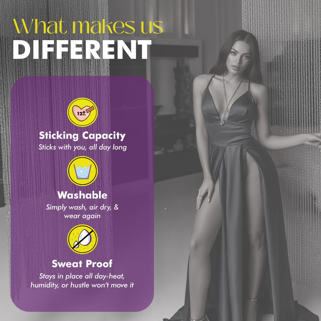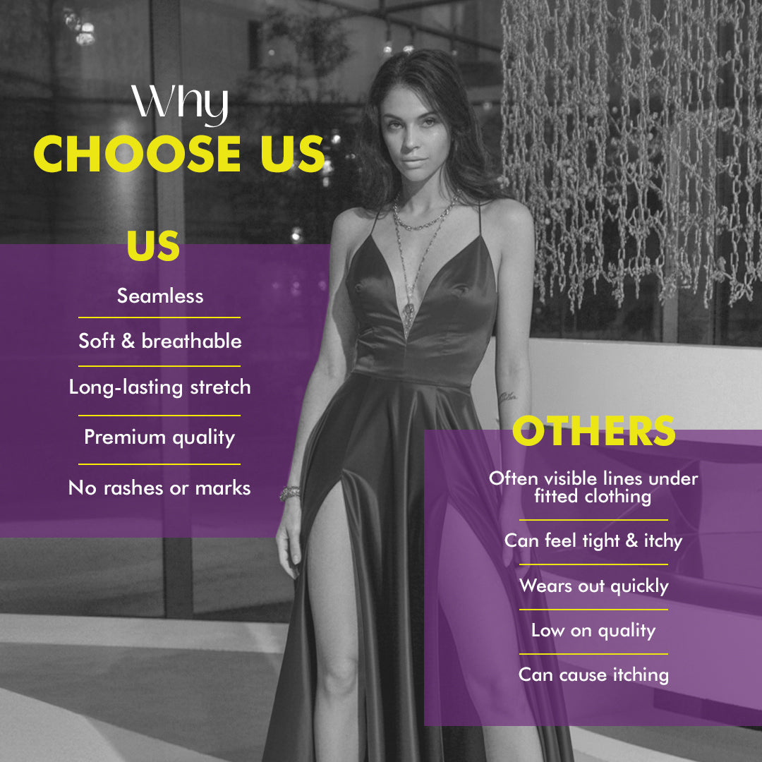 Ideal for use with long slit dresses, tight pants, tight fitted dresses, sheer dresses, wedding gowns etc.