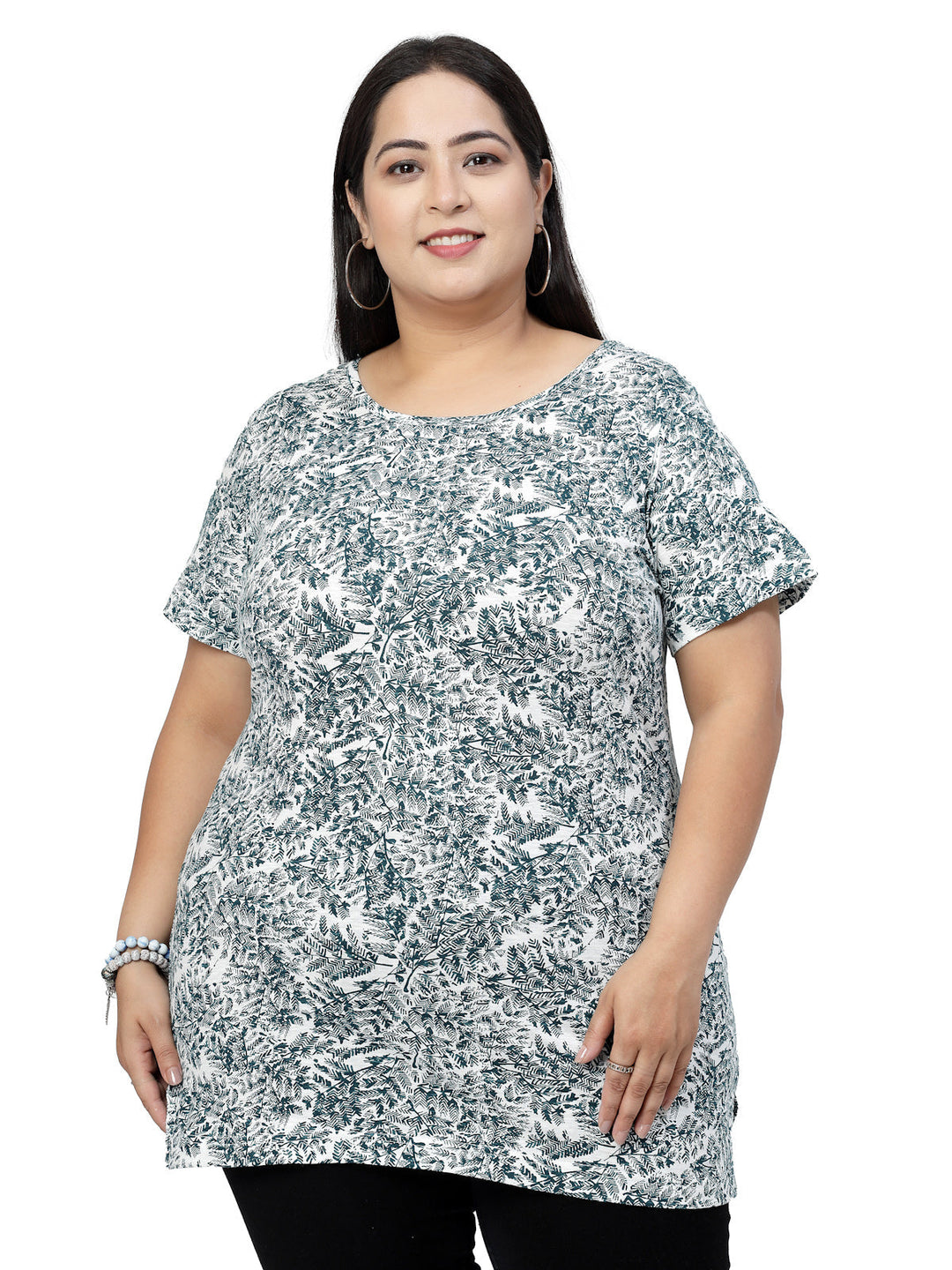 Plus Size Green Floral Printed Round Neck Regular Fit Cotton Casual T-shirt