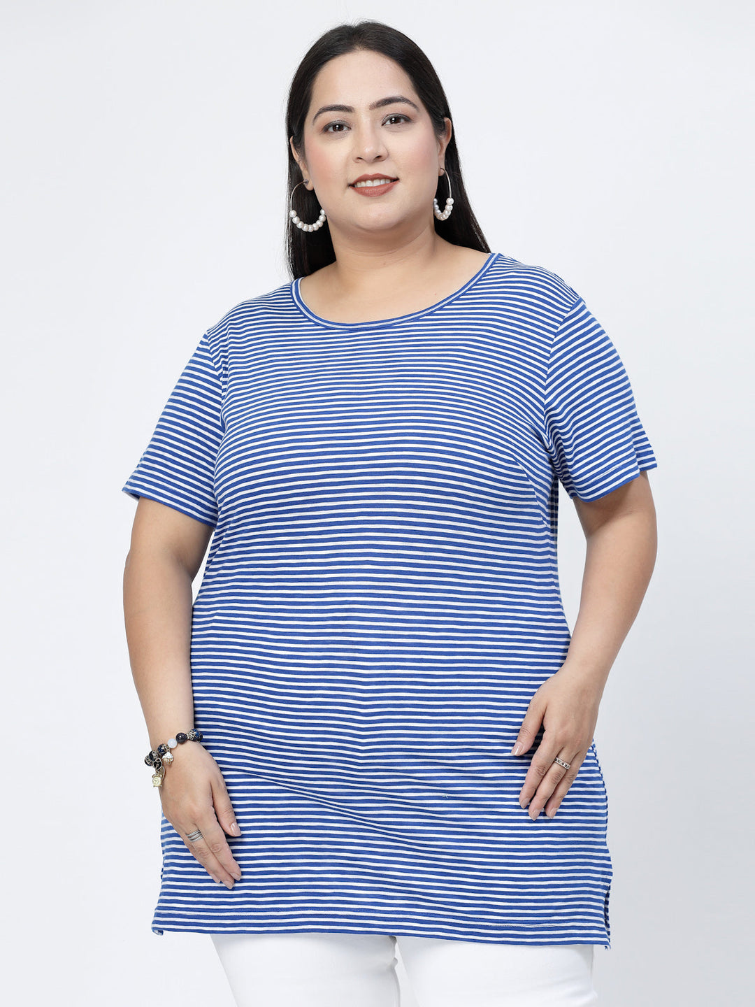 Plus Size Round Neck Short Sleeves Striped Cotton Regular Fit T-shirt