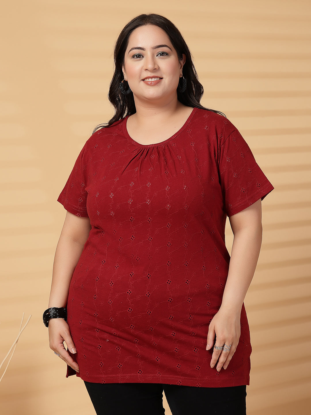 Plus Size Maroon Colourblocked Polo Collar Cotton T-Shirt
