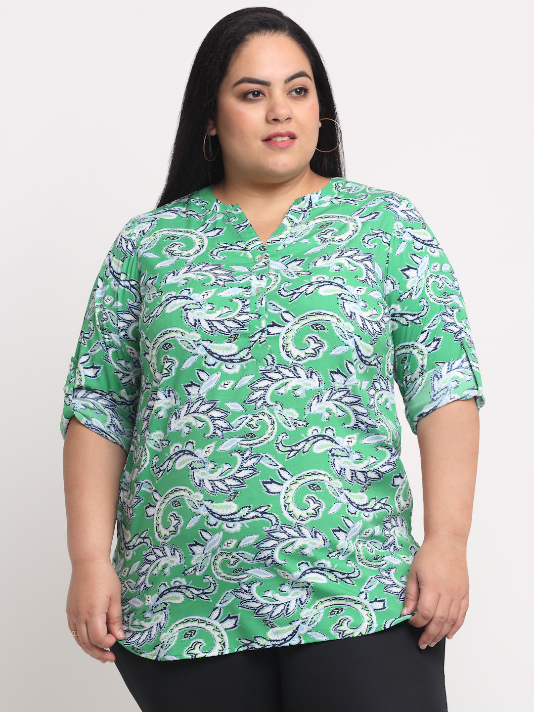 Plus Size Green Floral Print Mandarin Collar Roll-Up Sleeves Top