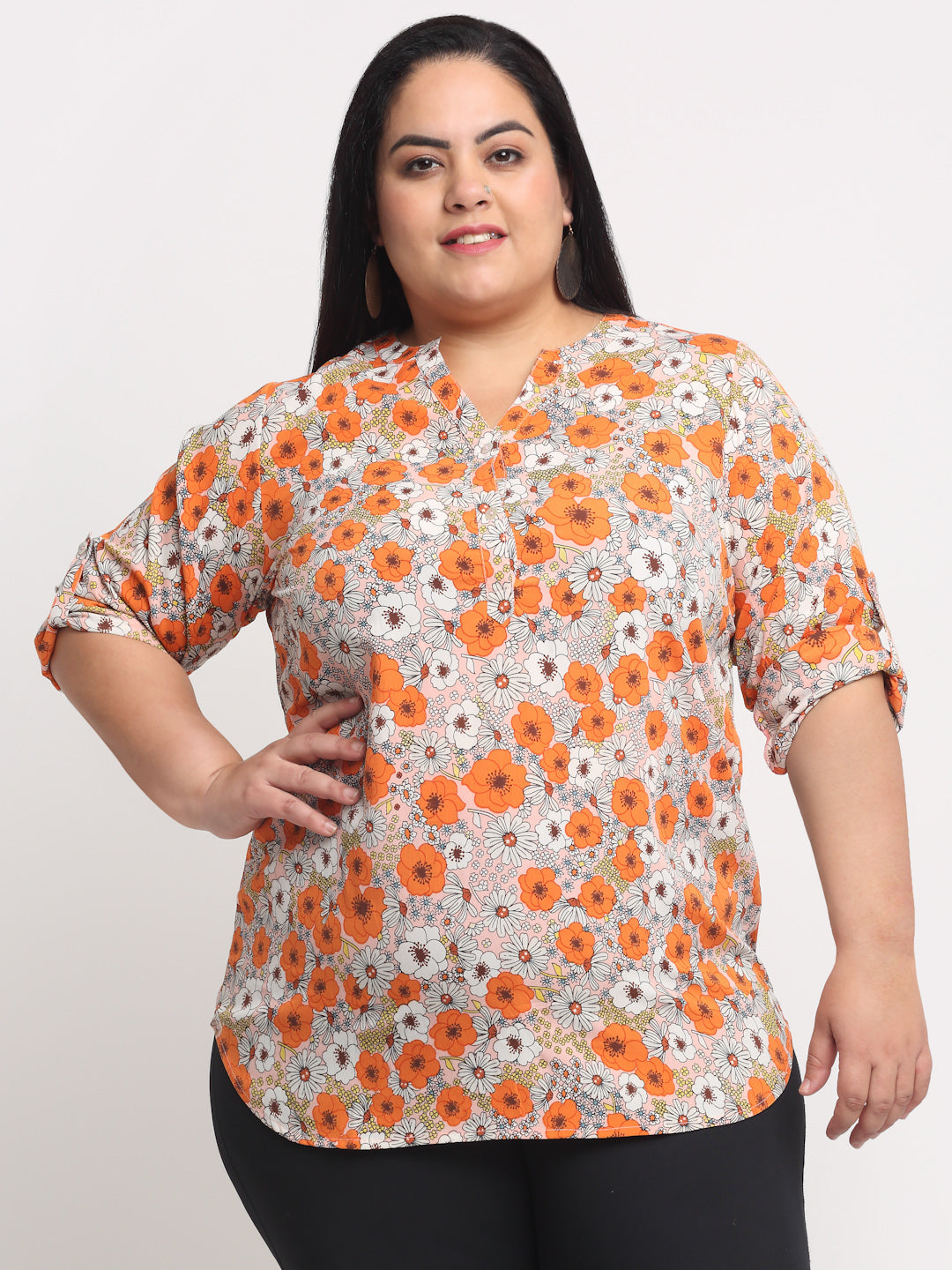 Plus Size Orange Floral Print Mandarin Collar Roll-Up Sleeves Top