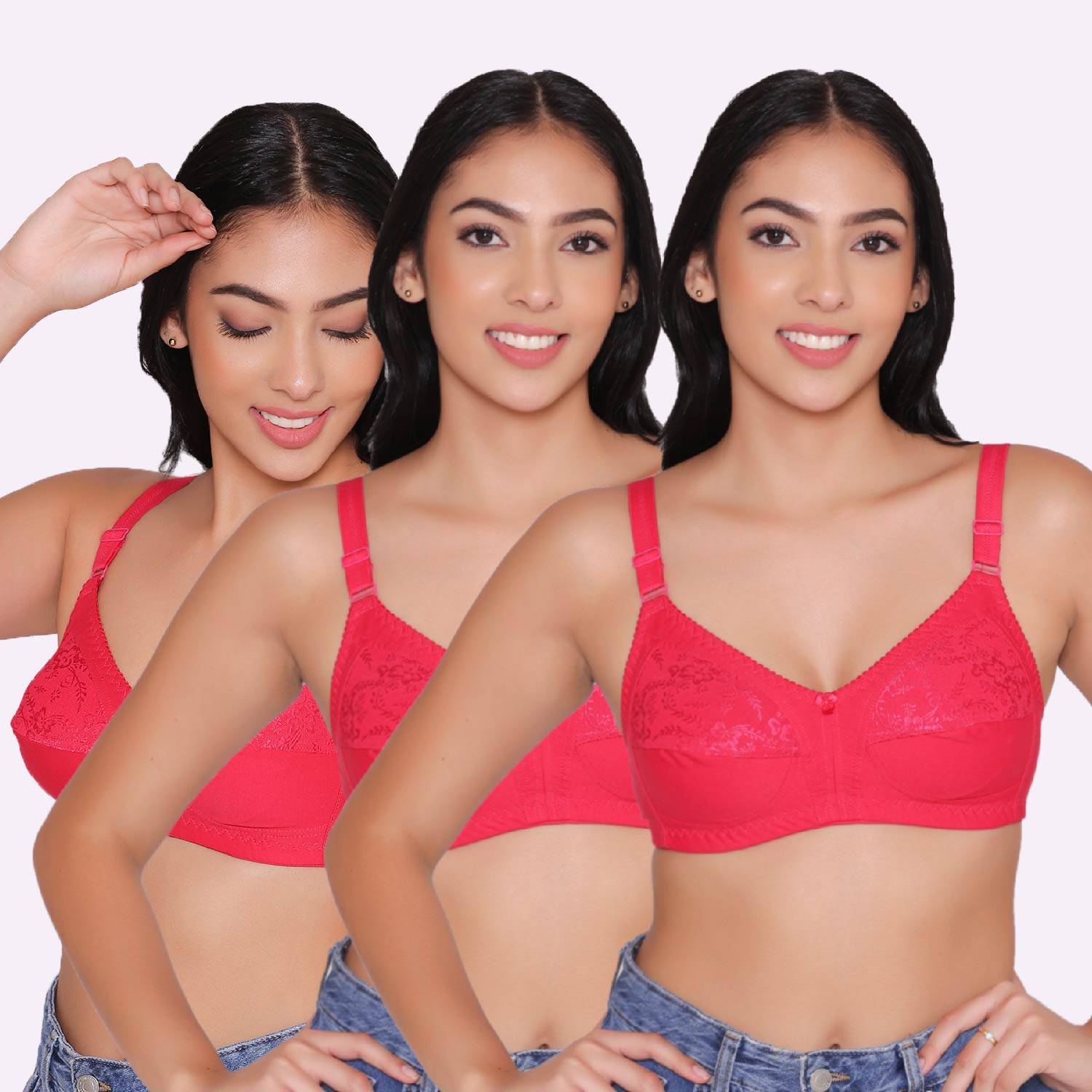 Meet our Bestseller Bra combo of 3 bras and get the support and comfort you've been looking for with this Full Coverage Cotton Minimizer bra. Layer with your favourite piece for a comfy ensemble. Confident outside, Comfortable inside. Available in B-C-D Cups, This combo of bras will make sure that your breast stays in place while doing your daily activities. Our everyday bras are carefully designed with Full coverage to ensure that there are no bulges and you feel more confident in any outfit you wear. INKURV is the expert for Non padded non wired Bras for all day wear. What makes us unique? Our bras give you the perfect fit under all your attires LIKE blouse, kurti, kurta, suit, saree, anarkali, etc..If you're someone who experiences side spillage or top spillage, this full-coverage bra is the ultimate solution to your problem. The cups provide maximum coverage and leave no spillage. This is an everyday wear bra & can be paired with all your formal, casual, western & ethnic outfits. The bra features non-wired cups and hence provides a poke-free experience. The top half of the cup is double layered with a comfortable net on top and cotton lining from inside which gives it a beautiful floral pattern.
