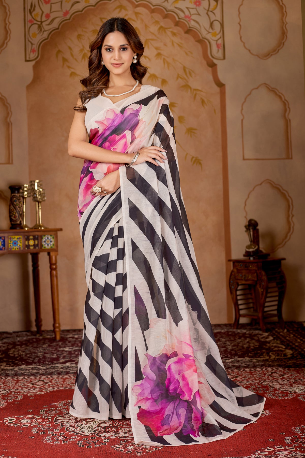 The digital print zebra and floral design gives an effortless clean look to the saree.