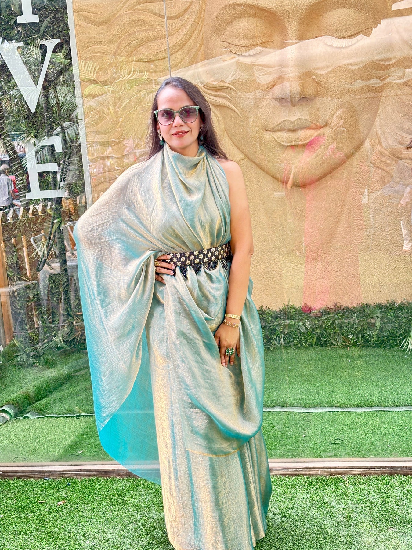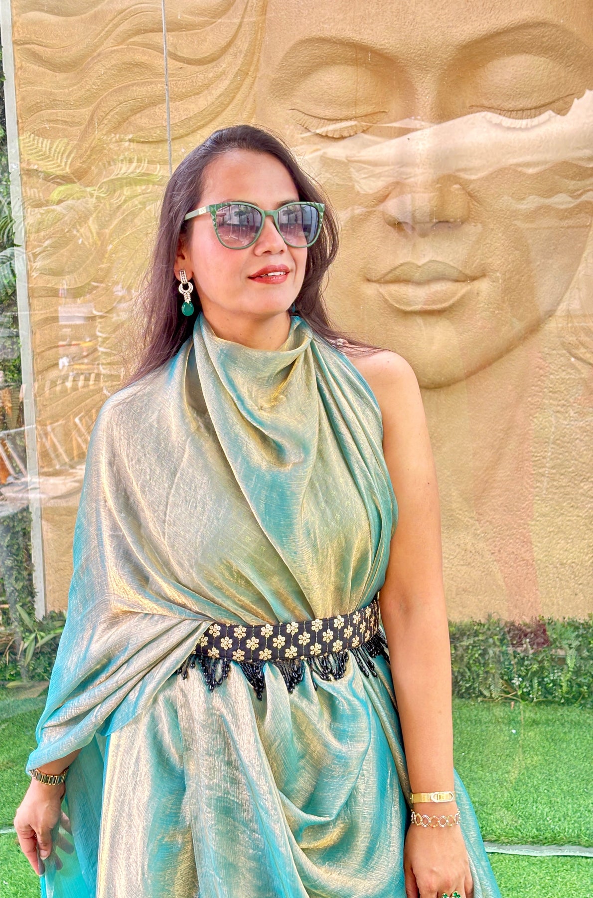 Get ready to dazzle at your next event with our stunning "Dhoop Chaav" Shimmer Saree. Designed for the ultimate party-goer, this saree features a magical dual-tone effect, shifting between radiant green and glittering gold as it catches the light. The shimmering fabric creates an illusion of liquid light, ensuring all eyes are on you.