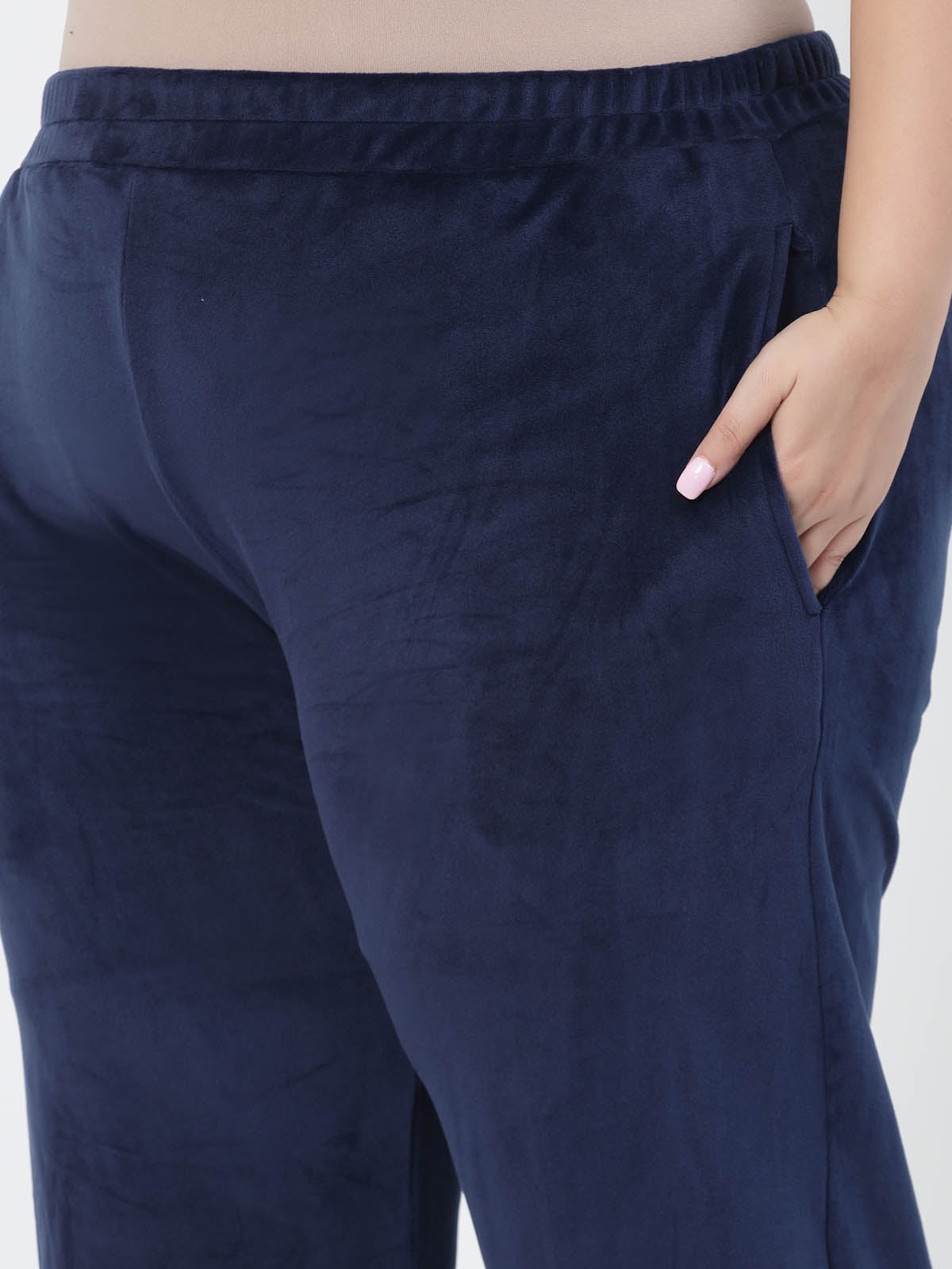 Plus Size Navy Blue Hooded Mid Rise Velour Tracksuits