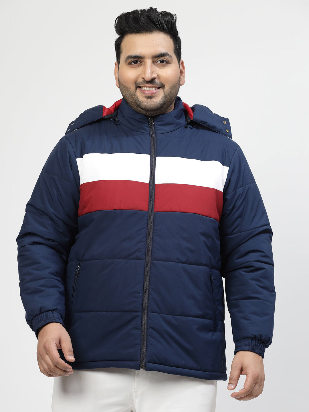 Plus Size Men Navy Blue & White Striped Detail Padded Jacket