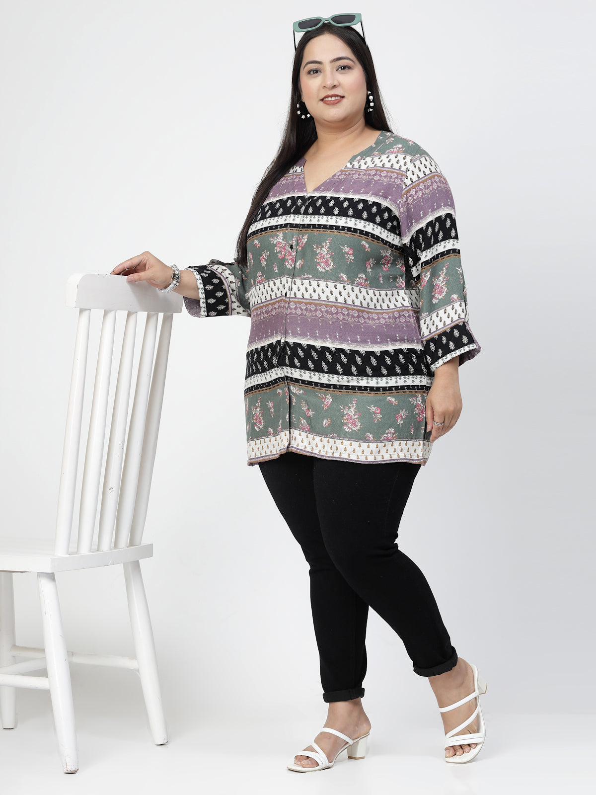 Plus Size Floral Printed Mandarin Collar Roll-Up Sleeves Top