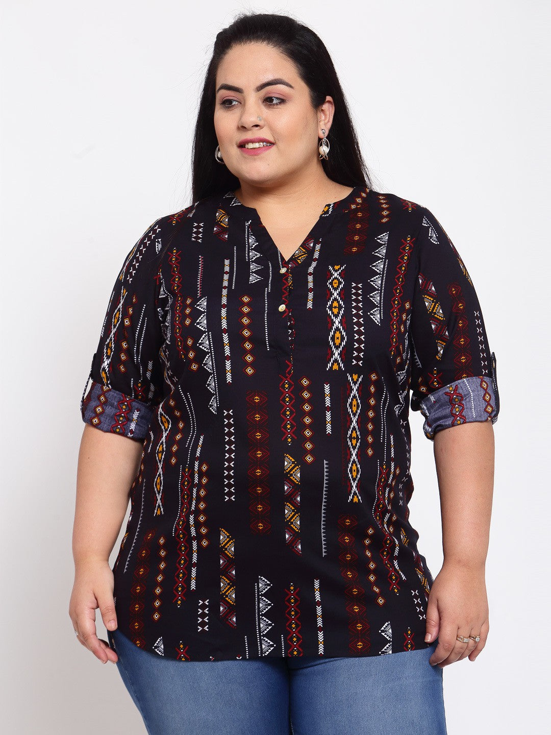 Plus Size Navy Blue Printed Shirt Style Top