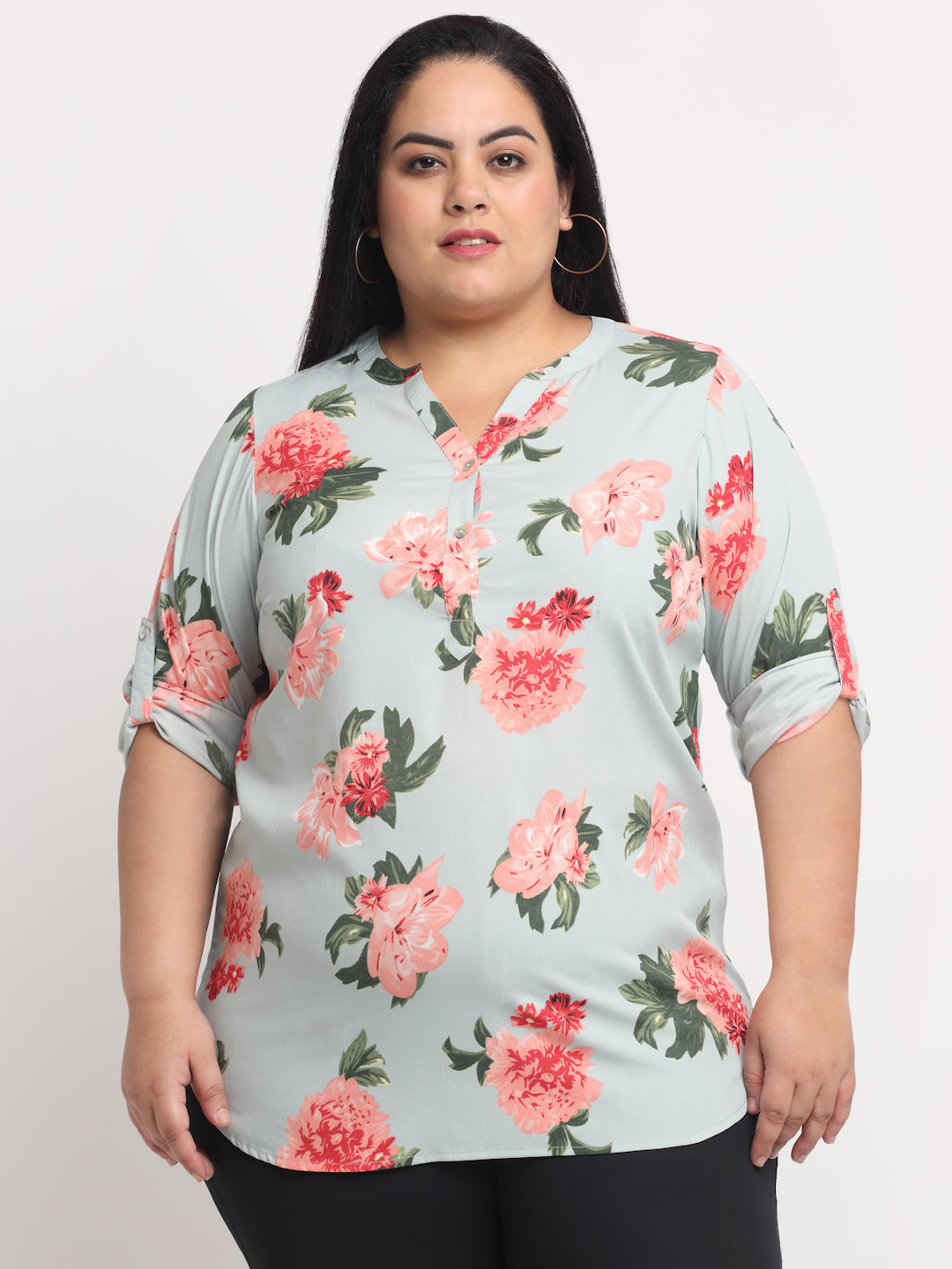 Plus Size Women Sea Green Red Floral Print Mandarin Collar Roll-Up Sleeves Top