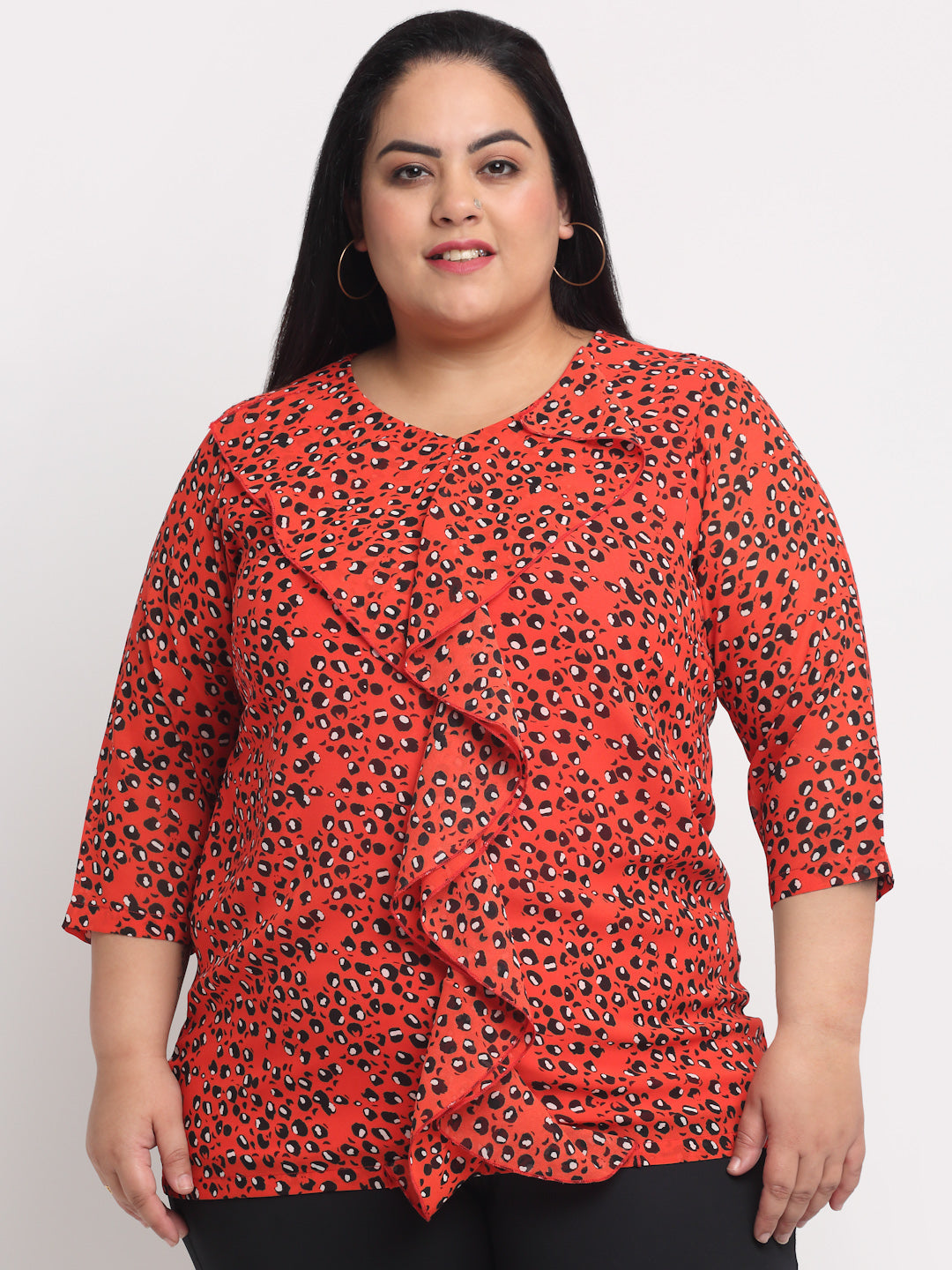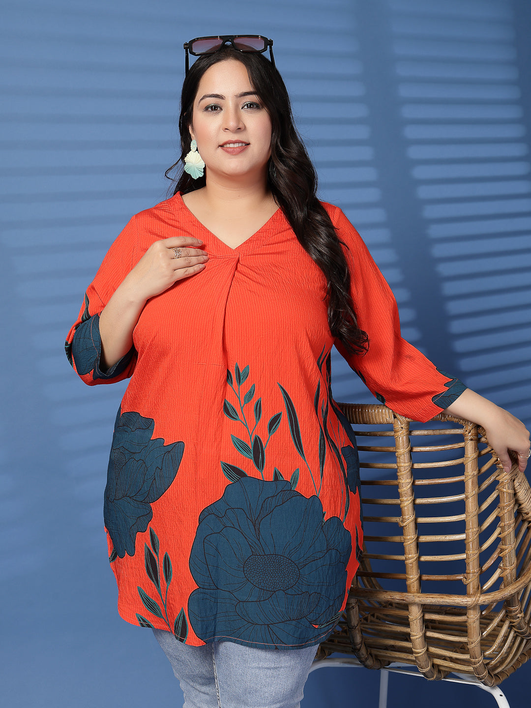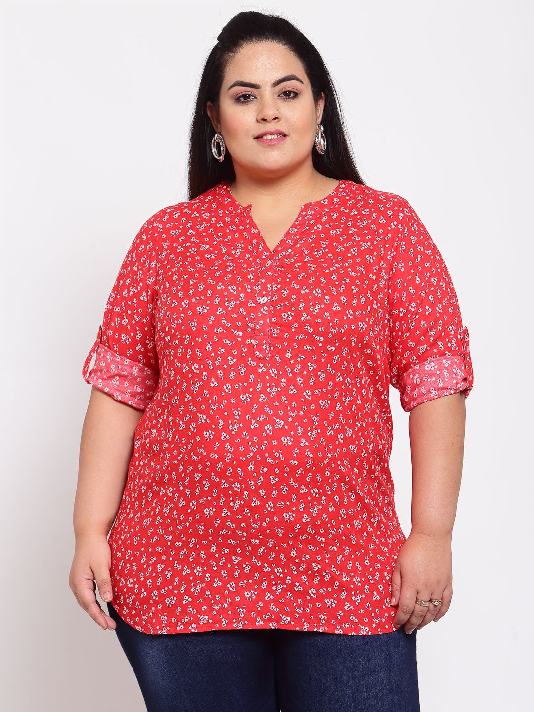 Plus Size Red Floral Print Mandarin Collar Shirt Style Top