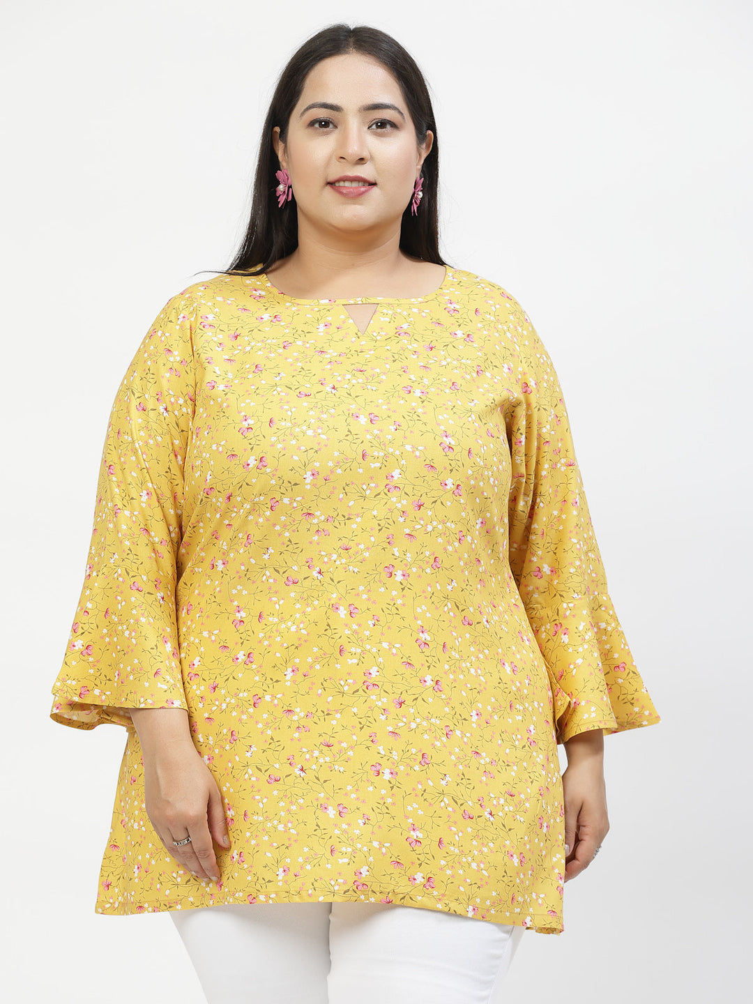 Plus Size Mustard Floral Printed Mandarin Collar Long Sleeves Longline Tops