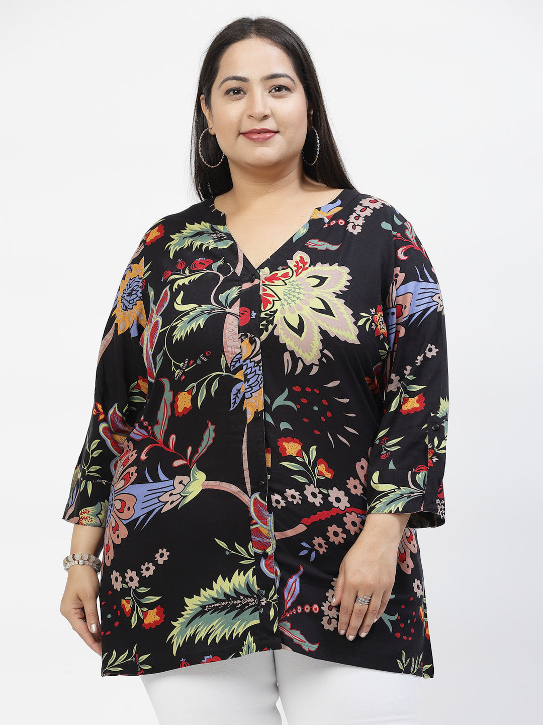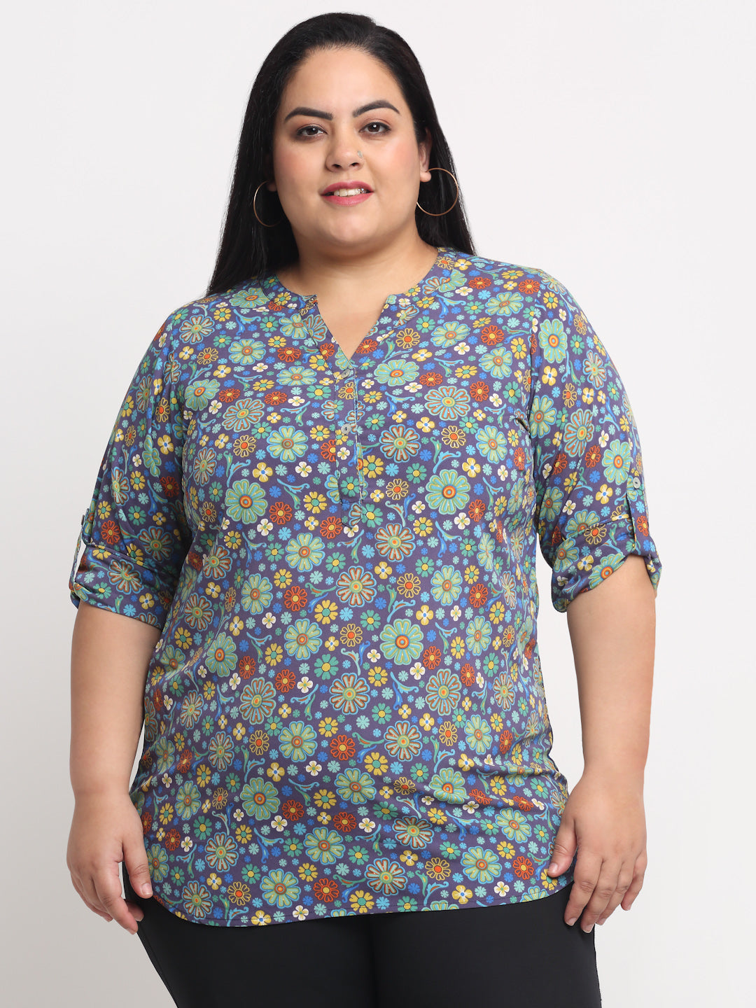 Plus Size Women Blue Brown Floral Print Roll-Up Sleeves Shirt Style Top