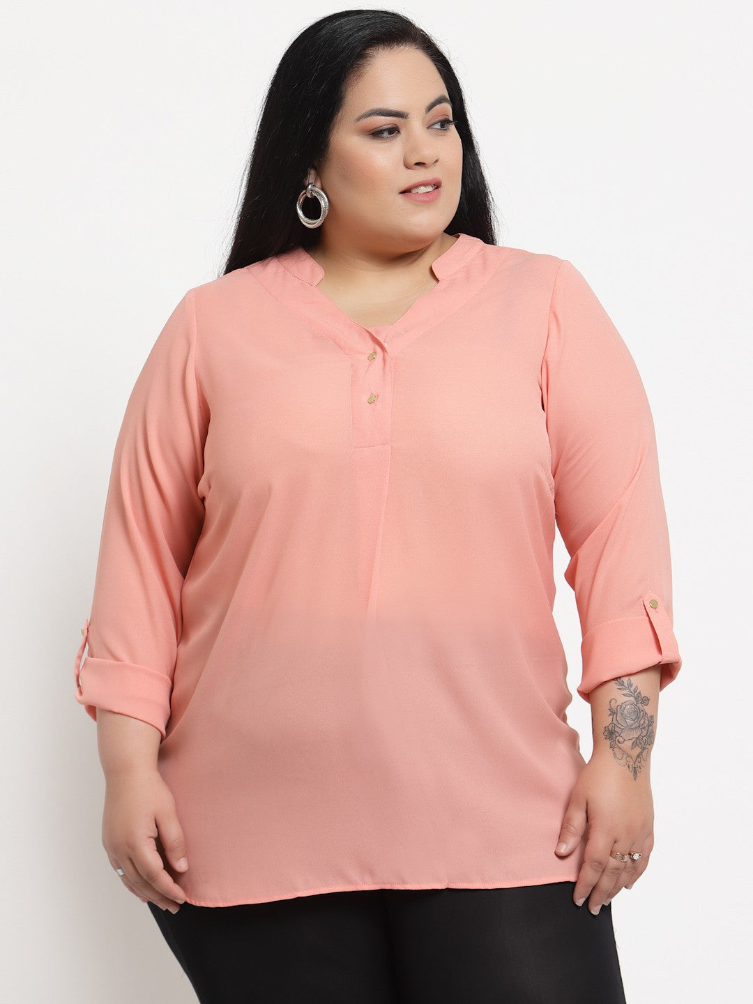 Plus Size Mustard Floral Printed Mandarin Collar Long Sleeves Longline Tops
