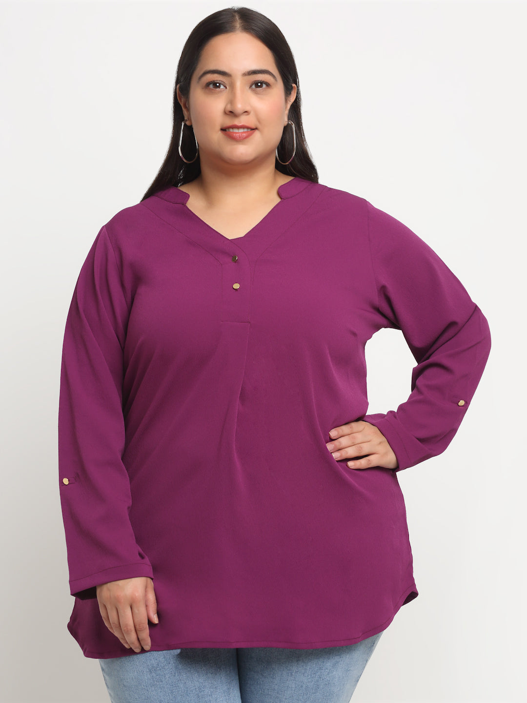 Plus Size Purple Yellow Printed Mandarin Collar Roll-Up Sleeves Top