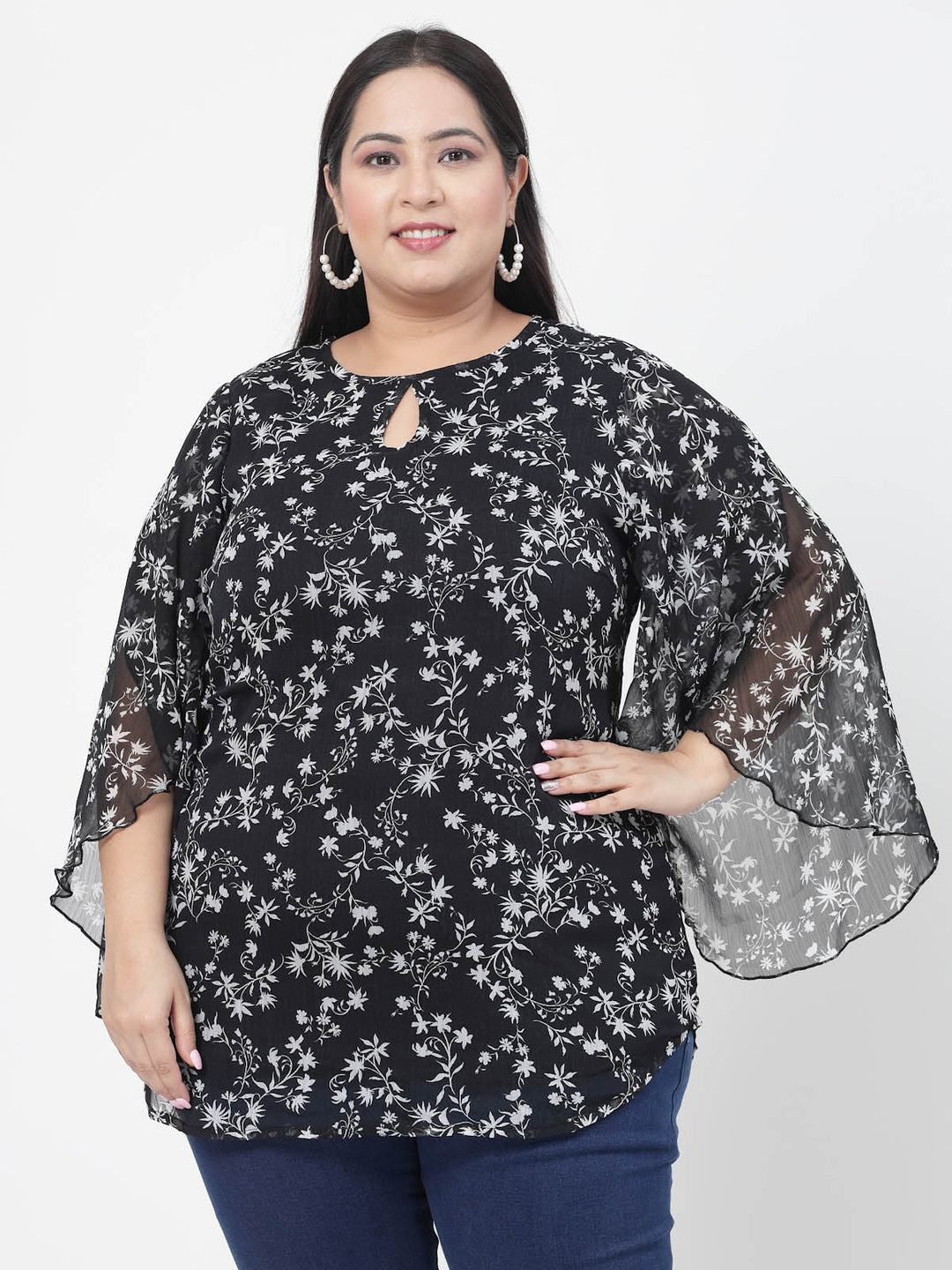 Plus Size Floral Printed Keyhole Neck Flared Sleeves Top