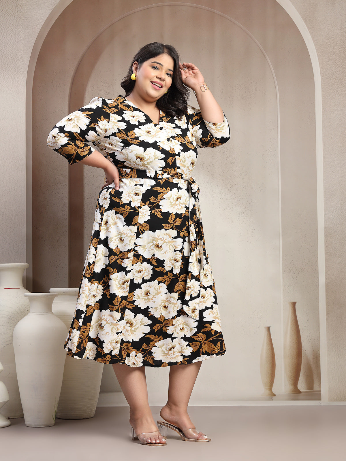 Plus Size Women Floral Printed V-Neck Fit And Flare Midi Dress