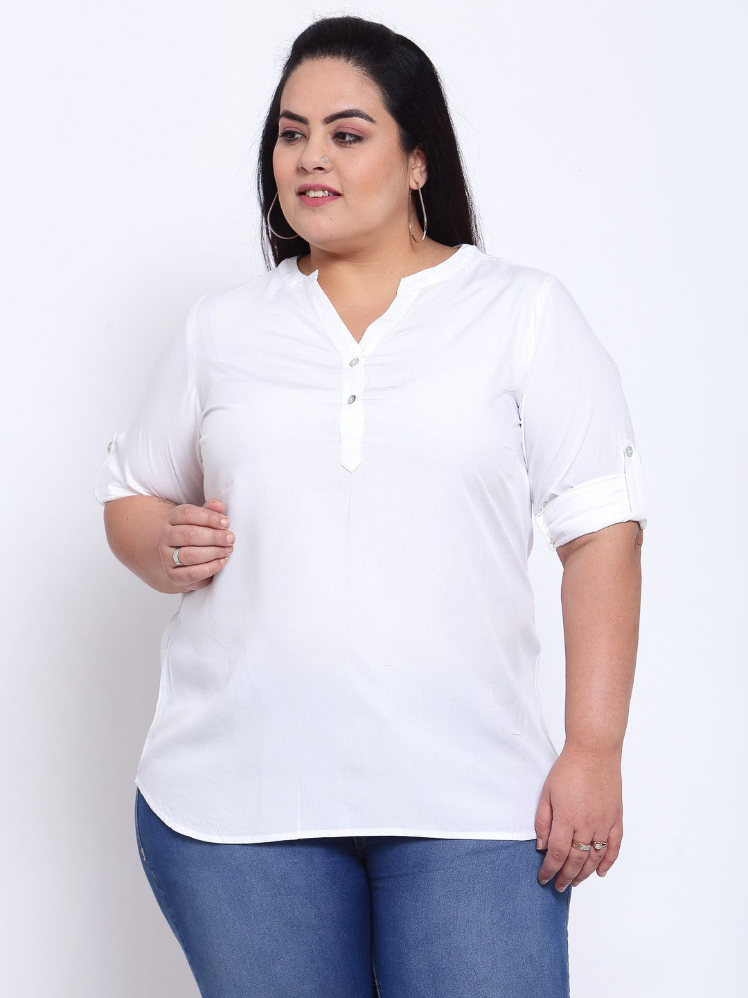 Plus Size Women White Mandarin Collar Shirt Style Top